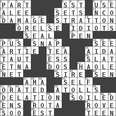 ACROSS 1. Piece 5. Fast jet (abbr.) 8. Purpose 11. Toward shelter 12. Puts into a specified state 13. Non-commissioned officer (abbr.) 14. Break 17. Ski resort town in Vermont 19. Threatening words 21. Foolish or stupid persons 22. Lick closed 23. Writing instrument 24. Fluid product of inflammation 27. Fastener 29. Observe 32. Nick name for Arthur 34. Afternoon social gathering 36. Opera by Verdi 37. Pulled tight 38. Double-curved letter 39. Narrow board 40. Inactive volcano in Sicily 41. Two (Sp.) 42. White Person, in Hawaii 43. Fish or hair follower 44. The founder of a family 46. Elected rep. 47. Wet nurse (var.) 50. Automatically 52. Declaimed 55. Ringlike coral islands and reefs 57. Conveyance 59. Dirtied 62. Followers of ems 63. Round or rotation of duties 64. Be footloose 65. "Barney Miller" actor Jack 66. Eastern Standard Time (abbr.) 67. Adolescent DOWN 1. Groovy apt. 2. Chicken ___ king 3. San ____ (Riviera town) 4. Pulls apart 5. Put into a specified state 6. Long narrow piece of something 7. Sadhe (variant) 8. To (old English) 9. Highlander 10. Immeasurably long periods of time 12. Compass dir. 15. Honkers 16. Enthusiasm 18. Shallow baking pan 20. Scheduled 24. Eucharist need 25. A salt of uric acid 26. Difficult or unusual or dangerous feat 28. Mexican monetary units 29. Grain storage towers 30. Peak District village in England 31. Consumed 33. Call ___ day 35. Help 36. White ___ sheet 42. Phone greeting 45. Vintage cars 47. "One Day ___ Time" 48. Distance measurement (Brit.) 49. Goodbye (Sp.) 51. Seductive woman who exploits men 52. Lyric poems 53. Western Nevada city 54. In addition 55. Santa ___, CA 56. A type of plum 58. Baseball player Mel 60. Night before a holiday 61. Lair