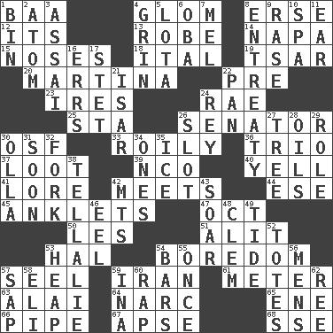 ACROSS 1. Sound made by sheep 4. Seize upon or latch onto something 8. Celtic language 12. ___ a Wonderful Life 13. Loose flowing garment 14. California wine valley 15. Olfactory organs 18. Slanted text style (abbr.) 19. Russian ruler of old 20. Chrissie's court nemesis 22. Before (prefix) 23. Angers 24. Actress Charlotte 25. R.R. building 26. Elected representative 30. Order of Saint Francis (abbr.) 33. Turbulent 36. Musical group of three 37. Plunder 39. Non-commissioned officer (abbr.) 40. Shout 41. Old wives' tales, e.g. 42. Confronts 44. Compass dir. 45. Short socks 47. Sep. follower 50. French article 51. Set down 53. Actor Linden 54. Mood resulting from idleness 57. Sew up the eyelids of hawks and falcons 59. SW Asia republic 61. Distance measurement 63. Jai ____ 64. Drug cop 65. Compass dir. 66. Corncob 67. Domed church section 68. Compass dir. DOWN 1. Storage container 2. Smallest unit of an element 3. Slender Brazilian palm 4. Smile widely 5. Globular water bottle used in Asia 6. Chief or king in Benin or Nigeria 7. Cartoonist voice _ Blanc 8. Plea 9. To erase 10. Health resort 11. Hearing organ 16. Blunders 17. Proofreading order 21. Austrian river, tributary to the Danube 22. Baking dish 24. Marina Del _, California 26. Slit 27. Relationship diagram 28. Lubricates 29. Hero or heavy, e.g. 30. Water jar 31. Within a short period 32. Tined utensil 34. Singles 35. Frozen water 38. Copy Pinocchio 42. Mountains (abbr.) 43. Fly high 46. Snakelike fish 48. To starve (Brit.) 49. Periodic rise and fall of the sea level 52. Hauls 53. Pile 54. Long, evenly shaped pieces 55. Single time 56. Not women's 57. Plant excrement 58. Connecticut Ivy Leaguer 59. _ tizzy (2 wds.) 60. Strike 62. Portuguese money of account (variant)