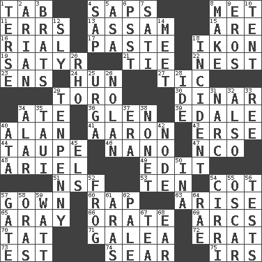 ACROSS 1. Bar bill 4. Plant excrements 8. Was introduced to 11. Blunders 13. Indian state 15. "We ___ not amused" (Victoria) 16. Monetary unit of Yemen 17. Thick mixture 18. Picture 19. Letch 21. Standoff 22. A home for chicks 23. Followers of ems 24. Attila the _ 27. Nervous spasm 29. "Corrida" creature 30. Middle Eastern gold or silver currency 34. Had dinner 36. Small, secluded valley 39. Peak District village in England 40. Actor Alda or Thicke 41. Composer Copland 43. Celtic language 44. Grayish beige 46. Billionth: prefix 47. Non-commissioned officer (abbr.) 48. Satellite of Uranus 49. Prepare for publication 51. Science/research agcy. 53. "___ Little Indians" 54. Small bed 57. Long dress 60. Hit sharply and swiftly 63. Originate 65. Like ___ of sunshine 66. Speak pompously 69. Curves 70. Make lace 71. An organ shaped like a helmet 72. Part of Q.E.F. 73. Eastern Standard Time (abbr.) 74. Singe 75. Big collection agency DOWN 1. Laconic 2. Believer in; advocate of (suffix) 3. Naughty children 4. Plant excrement 5. White ___ sheet 6. Inconspicuous attention getter 7. Suttee (variant) 8. Cause to be 9. Greek god of love 10. Portable shelter 12. Playfully artful 14. Confront 18. Event 20. 17th letter of the Greek alphabet 25. Capital and largest city of Mongolia 26. Pitcher Ryan 28. Binary compound 29. 3-inch nail 31. Drug cop 32. In addition 33. To separate or throw off 34. Having or resembling wings 35. "Change" in Tahitian 37. Epoch 38. Music written for nine 40. "One Day ___ Time" 42. Connecting point 45. Raised railways 50. _ tizzy (2 wds.) 52. Toadlike animal 54. High-altitude cloud 55. Witty Wilde 56. Trials 57. Yard entry 58. Mouths or openings 59. Electrical Unit 61. Ancient river in northeast Turkey 62. Diluted with white 64. Actress Charlotte 67. Beverage made from leaves 68. Hearing organ