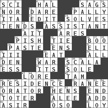ACROSS 1. _-fi 4. Actor Linden 7. Droops 11. And not 12. Have the gumption 13. Chummy 14. Call ___ day 15. Prepare for publication 16. Finds the solution 17. Looks after 19. Aide 21. Small island 23. Ancient Greek god of war 24. Expression of disdain 25. Make a knot 26. Surprise greeting 29. Thick mixture 30. Followers of ems 31. Connecticut Ivy Leaguer 32. One more than two 33. Consume 34. Everything 35. Lair 36. Armed conflict 37. Any of the three canals of the cochlea 40. Curvy letter 41. ___ a Wonderful Life 42. Flatfish 43. Old wives' tales, e.g. 45. Scottish cap 46. Dwelling 51. The wife of a rajah (variant) 55. Speaker 56. Coop moms 58. Conclude 59. Carrier 60. Toward shelter 61. Increase 62. SW Saudi Arabia district 63. Bear (Spanish) 64. Myrna of the movies DOWN 1. In a ____ (agitated or irritated) 2. ____ d'Azur (French Riviera) 3. SW Asia republic 4. Possessed 5. Roberta Peters solo 6. Allows 7. Table seasonings 8. Inventor's middle name 9. Small, secluded valley 10. System (abbr.) 12. Stop 13. Airs 16. Begets 18. Raised platform 20. Inhabitant of Heaven 22. Definite Article 24. Aches 25. Rends 26. Memphis, Tenn. Street 27. Water jar 28. Lubricate 29. Sliced desserts 32. Binary compound 33. Consumed 36. One who wires 37. Fast jet (abbr.) 38. Unrefined 39. _ mater 43. 61 cubic inches 44. Aroma 46. Round or rotation of duties 47. Greek god of love 48. Suttee (variant) 49. US Secretary of Labor Elaine L. _ 50. Snakelike fish 52. Anneal 53. Inside; within (prefix) 54. Whirlpool 57. Modern: prefix