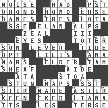 ACROSS 1. Annoying sound 6. Possessed 9. Pacific Standard Time (abbr.) 12. U. of Maine site 13. Same (prefix) 14. Celtic language 15. Natives or inhabitants of Denmark 16. Angers 17. Globular water bottle used in Asia 18. Compass dir. 19. Style 20. High mountains 21. Ardor 23. One more than two 24. Sight organs 25. Carrier 28. Boy, to dad 30. Prying instrument 34. Event that recurs at intervals 35. Elect 36. Ms. Damita and namesakes 38. Santa ___, CA 39. Armed conflicts 41. A person who is older than you are 43. Scottish cap 44. Bundle of cut stalks of grain 46. Assistant 48. _ moment's notice (2 wds.) 49. Portico 50. Astound 51. Atlas contents 53. Fast jet (abbr.) 56. Agitate 57. Female horse 58. Moving about 60. Peachy ____! 61. Supplemented with great effort 62. Climbing, woody, usually tropical vines 63. ___ a Wonderful Life 64. French article 65. Laconic DOWN 1. Lower and raise head in agreement 2. Mouths or openings 3. Charged particles 4. Dwarf with a sinus problem 5. Greek goddess of the dawn 6. Israeli folk dance 7. So be it 8. Two (Sp.) 9. Conciliate 10. Fast planes 11. Afternoon social gathering 13. Land elevation 14. American author Paul (1891-1958) 19. Artist's stand 20. Small island 22. Snakelike fish 24. Pleas 26. Pulitzer Prize-winning author Ferber 27. 480, 500 or 516 sheets of paper 28. Sty mamas 29. Brightly colored fish 31. Compete 32. Pipe bend 33. To free from 37. Theater features 40. Titan orbits this 42. River (Sp.) 45. Avid follower 47. Small ungulate mammals of Africa 49. Drove too fast 50. Proofreading order 51. Cause to be 52. Ancient Greek god of war 54. Play the lead 55. Metal containers 56. What Jean-Claude Killy likes to do 57. Cartoonist voice _ Blanc 58. The first octave above the treble staff 59. Actress Charlotte