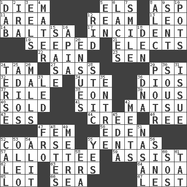 ACROSS 1. South Vietnam president (1954) 5. Raised railways 8. Cleo's killer 11. Length times width 12. 480, 500 or 516 sheets of paper 13. Lion 14. Greek mezzo-soprano Agnes 17. Happening 19. Oozed 21. Chooses 22. Water falling in drops from the sky 23. Elected rep. 24. Scottish cap 27. Backtalk 29. Air pressure measure (abbr.) 32. Peak District village in England 34. Shoshoni 36. "Vaya con ____" 37. Cause heat under the collar 38. Age 39. Horse sense 40. Exchanged or delivered for money 41. Be seated 42. Taiwanese island in East China Sea 43. Double-curved letter 44. Algonquian 46. Portuguese money of account (variant) 47. Opposite of masc. 50. Locale of original sin 52. Unrefined 55. Gossips 57. One to whom something is allotted 59. Aid 62. Luau accessory 63. Blunders 64. Small Philippine buffalo 65. Car dealer's back yard 66. Ocean 67. For fear that DOWN 1. Pat or tap gently 2. Retirement account (abbr.) 3. Snakelike fish 4. Mother 5. Car or cant ending 6. Shoestrings 7. Grin 8. Actor Baldwin 9. Transmitted 10. Cooking vessels 12. To free from 15. Gospel singer Marvin 16. Capital of Western Samoa 18. Lair 20. Follows as a consequence or result 24. Laconic 25. Goodbye (Sp.) 26. Promenades 28. Unemotional 29. Peter (Polish) 30. Lush 31. Come out of 33. Directed 35. Main course 36. Heredity factor (abbr.) 42. Confronts 45. Pulitzer Prize-winning author Ferber 47. Away 48. _____ Park, CO 49. Distance measurement (Brit.) 51. Rhinal 52. Give a ring to 53. Butter sub 54. Set down 55. Affirmative reply 56. Trig term 58. Epoch 60. Distress signal 61. Make lace