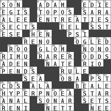 ACROSS 1. Male offspring 4. First man 8. Singer Brickell 12. The front part of a cuirass 14. Literary convention 16. "Two Mules for Sister ____" 17. Toward shelter 18. Pleas 20. Religious groups 22. Snakelike fish 23. Fast jet (abbr.) 24. Compass dir. 25. Layer 28. Air pressure measure (abbr.) 30. Former U.S. Attorney General Janet 31. Stared 35. Friend of Pooh 37. Take by theft 40. Words to Nanette 41. Tall New Zealand timber tree 42. More valued for its uncommonness 44. Likelihood 45. An important port of Yemen 46. Nathan's nickname 47. _ de Janeiro 48. Hangs 50. Court order 52. Ocean 54. Chief or king in Benin or Nigeria 55. Pacific Standard Time (abbr.) 58. Music discs 61. According to 63. Calif. Air Force Base 65. Abnormally rapid or deep breathing 70. Play the lead 71. Of or related to the anus 72. Underwater navigation system 73. Puts into a specified state 74. Painter Guido (1575-1642) 75. Remaining after all deductions 76. Born DOWN 1. Gospel singer Marvin 2. Stares at amorously 3. Sibling's daughter 4. Had dinner 5. Spanish title 6. Fitting 7. Greater amount 8. Eastern Standard Time (abbr.) 9. Raised platform 10. Angers 11. 90 degrees 13. Put into a specified state 15. Ooze 19. In addition 21. A female animal or person 26. Engineer (abbr.) 27. Pitcher Ryan 29. Refuse to acknowledge 30. Periods in a boxing match 32. Farming town in central California 33. Inside; within (prefix) 34. Two (Sp.) 35. Travel on or in a vehicle 36. Sign of things to come 38. Mouth or opening 39. Paris' subway 41. Strike 43. Reuben's nickname 49. Dry up 51. Experiment locale 53. High mountains 55. Eucharist need 56. Schedule 57. Laconic 58. Burn to charcoal 59. Centimeter-gram-second unit of force 60. Connect, as a bridge 62. Soon (poet.) 64. Curvy letter 66. Connecticut Ivy Leaguer 67. Single 68. Consume 69. Nonscientific branch of learning