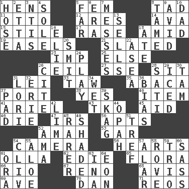 ACROSS 1. Coop moms 5. Opposite of masc. 8. Bit 11. Von Bismarck 12. Ancient Greek god of war 14. Actress Gardner 15. Vertical member of a panel or frame 17. To erase 18. Among 19. Artist's stands 21. Scheduled 23. Mischievous child 25. Otherwise 26. To provide with a ceiling 27. Compass dir. 28. Be seated 31. Luau accessory 33. The 23rd letter of the Hebrew alphabet 35. Phillipine bananalike plant 37. Left side of a ship or aircraft 38. Consenting reply 40. Detail 41. Satellite of Uranus 43. Ring climax 45. Help 46. Expire 47. Big collection agency 50. Flats, for short 52. Nursemaid 53. Slender fish 54. Device for capturing images 56. Centers of feelings and intuitions 61. Water jar 62. Singer Brickell 65. Plants 66. _ de Janeiro 67. Western Nevada city 68. Advice 69. "___ Maria" 70. Daniel's nick name 71. Vintage cars DOWN 1. Stockings 2. Singer James 3. Nuclear Threat Initiatives 4. Not divided or shared with others 5. At a great distance 6. Period 7. Makes clutter 8. Not wild 9. Enthusiastic 10. June honoree 13. Exchanges for money 16. Writer Wiesel 18. Had dinner 20. Stricken, poetically 22. At sea 24. Romp 26. Quote 28. Suttee (variant) 29. On the rocks 30. Scottish cap 31. Australian parrot (variant) 32. 4th largest of the Great Lakes 34. Dripping 36. Prejudice 37. Groovy apt. 39. Heroin 42. Welles in "The Third Man" 44. Brightly colored fish 48. Less widely known 49. Cast a shadow over 51. Not kosher 52. Wet nurse (var.) 54. 154 in Roman numerals 55. _ vera 57. Having or resembling wings 58. Be footloose 59. Musical group of three 60. Backtalk 61. Mouth or opening 63. _ tizzy (2 wds.) 64. A really long time
