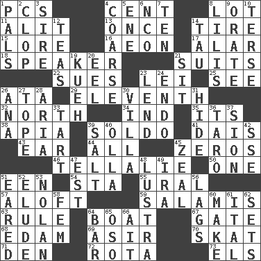 ACROSS 1. Personal Computers (abbr.) 4. Penny 8. Car dealer's back yard 11. Came down and settled, as after flight 13. At one time in the past 14. Hoop that covers a wheel 15. Old wives' tales, e.g. 16. A really long time 17. Having or resembling wings 18. Orator 21. Sets of matching outer garments 22. Takes to court 23. Flowery wreath 25. Perceive with the eye 26. "One Day ___ Time" 29. Veterans Day date 32. Compass direction 34. Working for oneself (abbr.) 35. It is 38. Capital of Western Samoa 39. Twentieth part of a lira 41. Raised platform 43. Hearing organ 44. Everything 45. Nothings 46. Copy Pinocchio 50. Single 51. Car or cant ending 54. R.R. building 55. Mountain range 57. Upward 59. Deli grouping 63. General guideline 64. Water vessel 67. Yard entry 68. Dutch treat 69. SW Saudi Arabia district 70. Three-handed card game 71. Lair 72. Round or rotation of duties 73. Raised railways DOWN 1. Friends 2. Hoof sound 3. Beget 4. Rough 5. Compass dir. 6. Non-commissioned officer (abbr.) 7. "___ Little Indians" 8. Ms. Damita and namesakes 9. Declaim 10. Laconic 12. Afternoon social gatherings 14. The 19th letter of the Greek alphabet 19. Malaysian steamed pastry 20. Snakelike fish 21. Be seated 23. Grant temporary use of 24. Inside; within (prefix) 26. Santa ___, CA 27. Drink excessively 28. Roberta Peters solo 30. Country residence 31. Flintstone garb 33. Small pie 36. Edible starchy tuberous root 37. The Jewish people; Israel 39. Table seasoning 40. Rounded earthenware pot or jar 42. Compass dir. 45. Ardor 47. Eastern Standard Time (abbr.) 48. A period of five years 49. Lyricist Gershwin 51. Having ears or earlike features 52. Evade 53. Pitcher Ryan 56. Fails to keep up a pace 58. Opposite of masc. 60. Cause to be 61. Slanted text style (abbr.) 62. Puts into a specified state 64. Long, evenly shaped piece 65. Bear (Spanish) 66. Small island