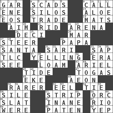 ACROSS 1. Slender fish 4. Large numbers or amounts 9. Give a ring to 13. Compass dir. 14. Grain storage towers 15. _ vera 16. Greek goddess of the dawn 17. Buy and sell 18. Floor coverings 19. Direct toward a target or goal 21. To free from 22. Sports stadium 24. Tenth: prefix 26. Spoil 27. Bull 29. Dad 30. Before Barbara or Clara 31. Indian skirt 33. Plant excrement 36. Affectionate concern, for short 37. Crying or shouting loudly 40. Epoch 41. Perceive with the eye 42. Rich soil 43. Satellite of Uranus 45. Event that recurs at intervals 47. Ancient Roman robes 48. Make supply last 49. A really long time 50. More uncommon 52. Snakelike fish 54. Neckwear 56. Drop; flow; fall 57. Remove all contents or possession from 59. The grampus (Milton) 61. Narrow board 62. Silly 63. _ de Janeiro 64. Past tense of be (plural) 65. Eucharist need 66. Slangy assent DOWN 1. Unit of force equal to gravity 2. Small Philippine buffalo 3. Home 4. Fast jet (abbr.) 5. High-altitude cloud 6. Mountain range southwest of Kyrgyzstan 7. Texas town _ City 8. Compass dir. 9. Device for capturing images 10. ____ Jay Lerner 11. Globular water bottle used in Asia 12. French article 20. Confront 22. At full speed 23. Hit sharply and swiftly 25. Supercomputer manufacturer 27. Fast planes 28. Falsehood 29. Demure 31. A type of plum 32. In the manner of 33. Signiory (variant) 34. Length times width 35. Friends 38. A person who is older than you are 39. Yard entry 44. Carrot, for example 45. Cylindrical with tapered ends 46. Eisenhower's nickname 49. Place in a line 50. Cause heat under the collar 51. Having or resembling wings 52. Inactive volcano in Sicily 53. Part of Q.E.F. 55. 4th largest of the Great Lakes 56. Compass dir. 57. Small drink 58. Writing instrument 60. Police officer (slang)