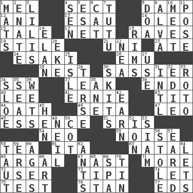 ACROSS 1. Cartoonist voice _ Blanc 4. Religious group 8. Moist 12. Black tropical American cuckoo 13. Son of Isaac 14. Margarine 15. Story 17. Remaining after all deductions 18. All-night dance parties 19. Vertical member of a panel or frame 21. Corn or form start 23. Had dinner 24. 1973 Nobel Price Winner (Physics) Leo 26. Australian flightless bird 28. A home for chicks 30. More impudent 34. Compass dir. 37. Path through which fluid escapes 39. Inside; within (prefix) 40. Area sheltered from the wind 41. Bert's buddy 43. Teat (slang) 44. Pledge 46. Bristle 47. Lion 48. Gist 51. Indian titles of respect 54. Modern: prefix 55. Annoying sound 58. Beverage made from leaves 61. Call ___ day 63. Brizilian seaport 65. Therefore, facetiously 67. Political cartoonist Thomas 71. Greater amount 72. One who makes use of a thing 73. Native american tent (variation) 74. Allow 75. Trial 76. Comedian Laurel of Laurel & Hardy 77. Begley and Asner DOWN 1. Floor coverings 2. Related on the mother's side 3. Ms. Damita and namesakes 4. Elected rep. 5. Compass dir. 6. Domesticated feline 7. Ballerina skirt 8. ___ good deed 9. Inventor's middle name 10. Rendezvous 11. Airs 16. Liveliness 18. Basketball hoops 20. Supplement with great effort 22. Teachers' org. 25. Small island 27. Purpose 29. Laconic 30. Burlesque acts 31. International (abbr.) 32. Singer Brickell 33. Printing process, for short 34. A type of plum 35. Oceans 36. Moistens 38. A saturated hydrocarbon 42. Merit 45. Layer 49. Famous astronaut Armstrong 50. Small bed 52. Electrically charged atom 53. Thailand, formerly 56. Fur scarf 57. Having ears or earlike features 58. Strained 59. Celtic language 60. Grows older 62. Pismires 64. Allows 66. Nonscientific branch of learning 68. Small island 69. Health resort 70. Shallow baking pan