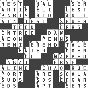 ACROSS 1. Egg locale 5. Actor Linden 8. Elected rep. 11. Nick name for Arthur 13. Biblical high priest 14. For fear that 15. Components 16. To free from 17. Against 18. _ moment's notice (2 wds.) 19. Trial 21. Imelda's hoard 22. Adolescent 24. Blunders 25. Main course 27. Fool 29. Period of immesurable duration 30. Actor Sean's family 32. Painter Guido (1575-1642) 33. Make improvements or corrections to 35. Lie 39. Keyboard key 41. Presage 42. Sep. follower 43. Slept 45. Blind as ____ 48. Celtic language 49. Place in a line 50. US Secretary of Labor Elaine L. _ 52. Regret 55. Sweet dark-red dessert wine 56. "We ___ not amused" (Victoria) 57. Any of the three canals of the cochlea 59. Soap bubbles 60. Mayday 61. _ Allan Poe 62. Begley and Asner 63. Fitting 64. Elected reps. DOWN 1. California wine valley 2. Part of Q.E.F. 3. Ski resort town in Vermont 4. Teat (slang) 5. Possessive pronoun 6. Came down and settled, as after flight 7. Flaplike covering 8. Sir (Sp.) 9. _____ Park, CO 10. Nuclear Threat Initiatives 12. First name in cosmetics 14. Cowardly lion portrayer 20. Compass dir. 21. Stitched 23. Bert's buddy 25. Ewer handle 26. Born 27. Lair 28. Plus 30. For each 31. Closes up, plugs up 33. And so on (abbr.) 34. Was introduced to 36. Electrical Measurement 37. Area sheltered from the wind 38. Conclusion 40. Short letter 43. Teachers' org. 44. Came up 45. Verbally 46. Avian creatures 47. Pismires 49. Domed church section 50. Riding implement 51. Command 53. ____ Bator 54. Hearing organs 56. White ___ sheet 58. Music discs