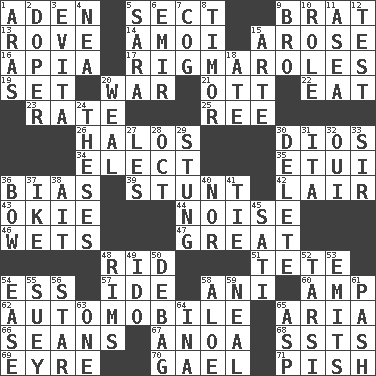 ACROSS 1. Arabian gulf 5. Religious group 9. Naughty child 13. Be footloose 14. Mine, in Marseilles 15. Came up 16. Capital of Western Samoa 17. Frustrating wastes of time 19. Arrange properly for use 20. Armed conflict 21. Baseball player Mel 22. Ingest 23. Assign a rank or rating to 25. To separate or throw off 26. Auras 30. "Vaya con ____" 34. Voters do this 35. Needle case 36. Prejudice 39. Check the growth or development of 42. Den 43. Migrant worker of the '30s 44. Annoying sound 46. Soaks 47. Relatively large 48. To free from 51. False hair 54. Curvy letter 57. Binary compound 58. Black tropical American cuckoo 60. Electrical Unit 62. Car 65. Operatic vocal solo 66. Seines 67. Small Philippine buffalo 68. Fast planes 69. Jane of fiction 70. Highlander 71. Expression of disdain DOWN 1. Caspian sea tributary 2. Drug addict 3. Webber/Rice musical 4. Teachers' org. 5. "Two Mules for Sister ____" 6. Independent ruler or chieftain 7. Gear tooth 8. The easternmost of the Lesser Sundas 9. Sis' sibling 10. Hero or heavy, e.g. 11. Toward the sea 12. Trial 15. Johnson of "Laugh-In" 18. Had dinner 20. Welt 24. College papers 27. French article 28. Sep. follower 29. Feeling sharp psychological pain 30. Keyboard key 31. Call ___ day 32. Fr. "Yes" 33. Title for a knight 36. Ribbon knot 37. Eisenhower's nickname 38. Small island 40. Not either 41. Neckwear 45. Suttee (variant) 48. Basketball hoops 49. Wedding promise 50. Debunk (Brit. slang) 52. Tarsus (plural) 53. Sends forth 54. Relaxation 55. Chop _ 56. Play the lead 58. Medicinal plant 59. Be tempered by heat 61. Romantic infatuation 63. Single 64. _ tizzy (2 wds.) 65. Viper