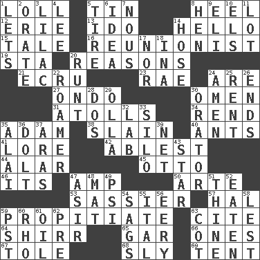 ACROSS 1. Hang loosely or laxly 5. Shallow baking pan 8. Person who is morally reprehensible 12. One of the Great Lakes 13. Wedding promise 14. Phone greeting 15. Story 16. One who advocates reunion 19. R.R. building 20. Thinks logically 21. Shade of tan 23. Actress Charlotte 24. "We ___ not amused" (Victoria) 27. Southwest Nigerian state 30. Presage 31. Ringlike coral islands and reefs 34. Tear apart 35. First of billions? 38. Killed 40. Pismires 41. Old wives' tales, e.g. 42. Most capable 44. Having or resembling wings 45. "Beetle Bailey" pooch 46. ___ a Wonderful Life 47. Electrical Unit 50. Johnson of "Laugh-In" 53. More impudent 57. Actor Linden 59. Conciliate 63. Quote 64. Bake eggs in their shells 65. Slender fish 66. Washington bills 67. Lacquered or enameled metalware 68. Stealthy 69. Portable shelter DOWN 1. Allows 2. Speak pompously 3. Pale purple color 4. Area sheltered from the wind 5. Become fatigued 6. It may be bright or harebrained 7. Good sense 8. Layer 9. Connecticut Ivy Leaguer 10. Raised railways 11. Car dealer's back yard 14. Flexible conduit 17. Or not 18. _ tizzy (2 wds.) 20. Undersized animal 22. Wanderer 24. So be it 25. Monthly bill 26. Extremities 28. Two (Sp.) 29. Water jar 30. Speaker 32. Experiment locale 33. Grain storage tower 35. Jai _ 36. Stupid person 37. Ancient river in northeast Turkey 39. Fish or hair follower 43. Play the lead 47. SW Saudi Arabia district 48. Floor covering 49. Air pressure measure (abbr.) 51. One or ones belonging to thee 52. Consumed 54. Droops 55. Slanted text style (abbr.) 56. Suggestive of the supernatural 58. For fear that 59. Pacific Standard Time (abbr.) 60. 17th letter of the Greek alphabet 61. Lubricate 62. Before (prefix) 63. Small bed