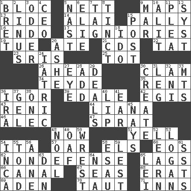 ACROSS 1. Group of countries in special alliance 5. Remaining after all deductions 9. Atlas contents 13. Travel on an animal 14. Mountain range southwest of Kyrgyzstan 15. Friendly 16. Inside; within (prefix) 17. Seigniories (variant) 19. Third day of the wk. 20. Had dinner 21. Music discs 22. Make lace 23. Indian titles of respect 25. Small child 26. Toward the future 30. Burrowing marine mollusk 34. Miss Universe 1986, Barbara Palacios _ 35. Monthly bill 36. Composer Stravinsky 39. Peak District village in England 42. The front part of a cuirass 43. Painter Guido (1575-1642) 44. Climbing, woody, usually tropical vines 46. Actor Baldwin 47. Small fatty European fish 48. At this time 51. Shout 54. Call ___ day 57. Rowing implement 58. Raised railways 60. Greek goddess of the dawn 62. Unrelated to defense, as in spending 65. Falls behind 66. Lessep's creation 67. Oceans 68. Part of Q.E.F. 69. An important port of Yemen 70. Strained 71. Restaurants DOWN 1. Cy Young winner Saberhagen 2. "_ and Lucy" (Charlie Brown theme song) 3. More peculiar 4. Corporate head (abbr.) 5. Political cartoonist Thomas 6. Writer Wiesel 7. Label 8. A color or tint 9. Make imperfect 10. Set down 11. Entreaty 12. System (abbr.) 15. Mail 18. Wedding promise 20. American tennis player Robert 24. Of or pertaining to medicine 27. Sight organ 28. Find the sum of 29. Allots cards 30. Cause to be 31. Part of a journey 32. Cuckoo 33. Mountains (abbr.) 36. Retirement account (abbr.) 37. Set 38. Single 40. Mouth edge 41. Hearing organ 45. Negative votes 48. Christmas carol 49. Clumsy lout 50. Take or capture by force 52. Acquire or gain knowledge or skills 53. Utah city north of Ogden 54. South American Indian 55. Frog relative 56. Singer Murray 58. He sold his birthright 59. For fear that 61. Fast planes 63. Daniel's nick name 64. Teachers' org. 65. Luau accessory