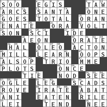 ACROSS 1. "Barney Miller" actor Jack 4. Armor plate that protects the chest 8. The 23rd letter of the Hebrew alphabet 11. Curves 13. Before Barbara or Clara 15. Single 16. Leaves 17. "_____ Recall" 18. NW Algerian seaport 19. Maternal 21. Mouth or opening 22. Electrical Unit 23. Male child 24. _-fi 27. Binary compound 29. Period of immesurable duration 30. Declaim 34. Actor Linden 36. Butter sub 39. NE Massachussets city 40. Place where flour is made 41. Memorize 43. I made a mistake 44. Columnist Joseph or Stewart 46. Musical group of three 47. Madame (abbr.) 48. Schemes 49. At one time in the past 51. Standoff 53. Dreamland 54. Observe 57. Stare 60. Part of a journey 63. Loads 65. Be footloose 66. Feeling or showing extreme anger 69. Blind as ____ 70. Cuckoo 71. Ingested 72. Cause heat under the collar 73. Luau accessory 74. Look after 75. Born DOWN 1. Gurus 2. U. of Maine site 3. Sea 4. Eastern Standard Time (abbr.) 5. E Mali city 6. To the inside or interior of 7. Play the lead 8. "Corrida" creature 9. Of or related to the anus 10. Gone 12. Fast jet (abbr.) 14. Jai ____ 18. Conquer 20. Compass dir. 25. Calm and collected 26. An arm off of a larger body of water 28. ___ good deed 29. One to whom something is allotted 31. Smallest unit of an element 32. Drink excessively 33. Followers of ems 34. Land elevation 35. In addition 37. Hearing organ 38. Greek mythologigal hunter 40. Atlas unit 42. Words to Nanette 45. Air pressure measure (abbr.) 50. Music discs 52. Writer Wiesel 54. Unit of acoustic absorption 55. Peak District village in England 56. First name in cosmetics 57. Relating to the mouth 58. Went 59. 57 in ancient Rome 61. Part of Q.E.F. 62. Yard entry 64. Auto 67. "___ Little Indians" 68. Conclude