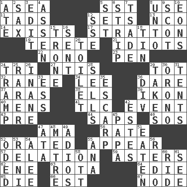 ACROSS 1. Toward the sea 5. Fast jet (abbr.) 8. Purpose 11. Small amounts or degrees 12. Arranges properly for use 13. Non-commissioned officer (abbr.) 14. Has an existence 17. Ski resort town in Vermont 19. Cylindrical with tapered ends 21. Foolish or stupid persons 22. Words to Nanette 23. Writing instrument 24. Three (prefix) 27. Nuclear Threat Initiatives 29. Small child 32. Indian princess (variant) 34. Area sheltered from the wind 36. Have the gumption 37. Ancient river in northeast Turkey 38. Raised railways 39. Image 40. Not women's 41. Affectionate concern, for short 42. Incident 43. Before (prefix) 44. Plant excrements 46. Distress signal 47. Wet nurse (var.) 50. Pace 52. Declaimed 55. Become visible 57. Conveyance 59. Michaelmas daisies 62. Compass dir. 63. Roll call or roster of names 64. Singer Brickell 65. Expire 66. Eastern Standard Time (abbr.) 67. Thickened enlargement DOWN 1. Had dinner 2. Saxophone 3. Prepare for publication 4. NE Netherlands city 5. Put into a specified state 6. Long narrow piece of something 7. Sadhe (variant) 8. To (old English) 9. Native of Scotland 10. Immeasurably long periods of time 12. Compass dir. 15. Heavy duty weighing machine 16. Posted 18. Shallow baking pan 20. Bathroom plumbing fixture 24. _____ steamer (cargo ship) 25. More valued for its uncommonness 26. Empty; void 28. Exchanges for money 29. Proceeds 30. U. of Maine site 31. Portable shelters 33. Curvy letter 35. Fortification 36. HTML Container Element 42. _____ Park, CO 45. Dad 47. _ moment's notice (2 wds.) 48. Distance measurement (Brit.) 49. Goodbye (Sp.) 51. Ingested 52. Wrote a lyric poem 53. Painter Guido (1575-1642) 54. Toward shelter 55. Santa ___, CA 56. Redecorate 58. Baseball player Mel 60. To free from 61. Perceive with the eye