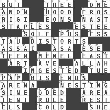 ACROSS 1. With the exception that 4. Family _ (genealogy) 8. Single 11. At once, immediately (arch.) 13. Parka part 14. Greek god of love 15. Swiss mountan, "Queen of the Mountains" 16. Immeasurably long periods of time 17. Political cartoonist Thomas 18. Paper fasteners 21. First name in cosmetics 22. Not divided or shared with others 23. Ichor 25. Curvy letter 26. The 19th letter of the Greek alphabet 29. What propaganda does 32. Slender Brazilian palm 34. White ___ sheet 35. Compass dir. 38. Adolescent 39. Klaipeda city 41. Compass direction 43. Tate display 44. "___ Maria" 45. Assad's deity 46. Eaten 50. Third day of the wk. 51. Infant food 54. Altar cloth linen 55. Extremities 57. Sports stadium 59. Inhabiting a nest 63. Trig term 64. Wrote a lyric poem 67. Type of rug 68. Portable shelter 69. Court order 70. Repose 71. Raised railways 72. Lacking warmth 73. A female animal or person DOWN 1. Soap units 2. A single undivided whole 3. Ancient Roman robe 4. College papers 5. Friend of Pooh 6. Age 7. Begley and Asner 8. Declaim 9. Olfactory organs 10. _____ Park, CO 12. Cuts off 14. Followers of ems 19. Farming town in central California 20. Biblical high priest 21. Eastern Standard Time (abbr.) 23. Airs 24. Mountain range 26. Make lace 27. Toward the sea 28. One who uses or employs something 30. Corrects by punishment or discipline 31. Sew up the eyelids of hawks and falcons 33. Opposed to 36. Table seasoning 37. Son of Isaac 39. Wise men 40. Nights before holidays 42. Definite Article 45. Does sums 47. Basketball assoc. 48. Looked after 49. Compass dir. 51. Thick mixture 52. Satellite of Uranus 53. Actor Sean's family 56. Play the lead 58. Fish or hair follower 60. Angers 61. Delicate 62. Yard entry 64. The grampus (Milton) 65. Superhero pair 66. Pipe bend