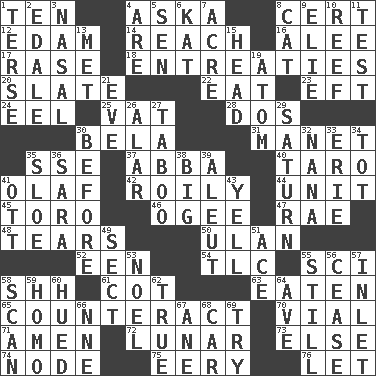 ACROSS 1. Nine, plus one 4. "____ silly question..." 8. An absolute certainty 12. Dutch treat 14. Arrive at 16. Toward shelter 17. Raze (variant) 18. Pleas 20. Chalkboard 22. Consume 23. Lizard (obsolete) 24. Snakelike fish 25. Large container 28. Two (Sp.) 30. Actor Lugosi 31. French painter Edouard 35. Compass dir. 37. Swedish rock group 40. Edible starchy tuberous root 41. Norwegian king 42. Agitated, as a liquid 44. A single undivided whole 45. "Corrida" creature 46. Double curve, resembling the letter S 47. Actress Charlotte 48. Pulls apart 50. ____ Bator 52. Car or cant ending 54. Affectionate concern, for short 55. _-fi 58. Quiet! 61. Small bed 63. Consumed 65. Neutralize 70. Small bottle 71. So be it 72. Type of eclipse 73. Otherwise 74. Thickened enlargement 75. Suggestive of the supernatural 76. Allow DOWN 1. Laconic 2. Peak District village in England 3. Relating to the nose 4. "We ___ not amused" (Victoria) 5. Elected rep. 6. Krazy ___ of comics 7. Measure of real estate 8. Domesticated feline 9. Writer Wiesel 10. Coral ridge 11. Trial 13. Was introduced to 15. Froth on beer 19. Smallest unit of an element 21. Night before a holiday 26. Having or resembling wings 27. Off limits 29. Titan orbits this 30. Prior to 32. Nanny 33. One of the Great Lakes 34. Small child 35. A type of plum 36. "Two Mules for Sister ____" 38. Large 39. Native American of Southwest Alaska 41. Baseball player Mel 43. Shout 49. Religious group 51. Adept person 53. Christmas carol 55. Not moving 56. Desist 57. An arm off of a larger body of water 58. Skim 59. Like (prefix) 60. Took on color 62. Loyal 64. "___ Maria" 66. Compass dir. 67. One (Scot) 68. 4-wheeled motor vehicle 69. Attempt