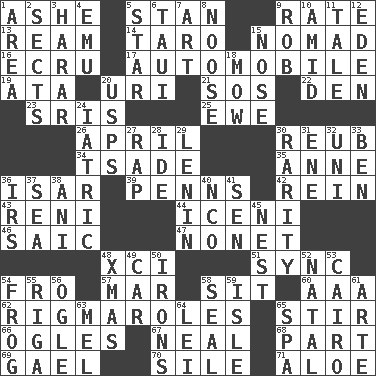 ACROSS 1. American tennis player Robert 5. Comedian Laurel of Laurel & Hardy 9. Assign a rank or rating to 13. 480, 500 or 516 sheets of paper 14. Pacific island yam 15. Wanderer 16. Shade of tan 17. Form of transportation 19. "One Day ___ Time" 20. RI univ. 21. Distress signal 22. Lair 23. Indian titles of respect 25. She-sheep 26. Showery time 30. Reuben's nickname 34. Sadhe (variant) 35. Queen of England 1702-14 36. Austrian river, tributary to the Danube 39. Actor Sean's family 42. It's straight from the horse's mouth 43. Painter Guido (1575-1642) 44. Ancient Celtic tribe of eastern Britain 46. Ketch in the Levant 47. Music written for nine 48. One more than ninety 51. Synchronize (abbr.) 54. Back 57. Third mo. 58. Be seated 60. Auto club (abbr.) 62. Complicated, petty procedures 65. Move through with a circular motion 66. Stares 67. Anneal 68. Component 69. Highlander 70. Drop; flow; fall 71. Medicinal plant DOWN 1. Type of rug 2. Religious groups 3. Ethiopian city, capital of Harari 4. Australian flightless bird 5. Play the lead 6. "Change" in Tahitian 7. Tate display 8. Trap for birds or small mammals 9. Director Reiner 10. Among 11. Falsehood 12. Locale of original sin 15. Olfactory organ 18. Cut the grass 20. United States Postal Service (abbr.) 24. Of or pertaining to medicine 27. Reproach for some lapse or misdeed 28. Binary compound 29. Soviet premier 1918-24 30. Noteworthy scarcity 31. Compass dir. 32. Corn or form start 33. Benjamin's nick name 36. Big collection agency 37. Ocean 38. Cuckoo 40. Non-commissioned officer (abbr.) 41. Elected rep. 45. Egg locale 48. Dec. holiday 49. Automobile 50. Removes the wrinkles 52. Relating to or accompanying birth 53. Capital of Egypt 54. Tree-dwelling hopper 55. Capital of Latvia 56. Stare 58. Lick closed 59. Small island 61. Johnson of "Laugh-In" 63. Cartoonist voice _ Blanc 64. Flowery wreath 65. Health resort