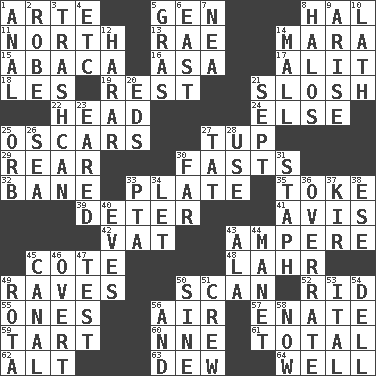 ACROSS 1. Johnson of "Laugh-In" 5. Commissioned military rank (abbr.) 8. Actor Linden 11. 0 degrees 13. Actress Charlotte 14. Hindu Mythology: god of death 15. Phillipine bananalike plant 16. White ___ sheet 17. Set down 18. French article 19. State of inaction 21. Agitate, as a liquid 22. Froth on beer 24. Otherwise 25. Motion picture awards 27. Uncastrated adult male sheep 29. Rump 30. Goes without food and/or water 32. Object of repulsion 33. Food holder 35. Casino tip 39. Prevent from occurring 41. Deliberation 42. Large container 43. Electrical Unit 45. ____ d'Azur (French Riviera) 48. Cowardly lion portrayer 49. All-night dance parties 50. Examine hastily 52. To free from 55. Washington bills 56. Atmosphere 57. Related on the mother's side 59. Small pie 60. Compass dir. 61. "_____ Recall" 62. Keyboard modifier key 63. Morning condensation 64. Water source DOWN 1. Of or related to the anus 2. Loose flowing garment 3. File 13 4. And so on (abbr.) 5. Pate de foie ____ 6. 90 degrees 7. Teachers' org. 8. Auras 9. Ascend 10. Thin strip of wood or metal 12. Ethiopian city, capital of Harari 14. Shopping center 20. Begley and Asner 21. Back-to-school mo. 23. Having ears or earlike features 25. Globe 26. Ocean 27. Make lace 28. Purpose 30. At a great distance 31. Staphylococcus 33. Parent Teacher Assoc. 34. Allow 36. Make much ado about nothing 37. Apertif with cassis 38. Compass dir. 40. Nights before holidays 43. According to 44. French painter Edouard 45. Lessep's creation 46. Unconcealed 47. Trial 49. Roll call or roster of names 50. Trig term 51. Ship's personnel 53. Slanted text style (abbr.) 54. Small valley 56. Also 58. Immediately