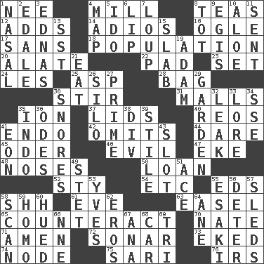 ACROSS 1. Born 4. Place where flour is made 8. Beverages made from leaves 12. Does sums 14. Goodbye (Sp.) 16. Stare 17. Without 18. Census information 20. Having winglike extensions 22. Writing tablet 23. Put into a specified state 24. French article 25. Viper 28. Container for groceries 30. Tumult 31. Shopping centers 35. Electrically charged atom 37. Flaplike coverings 40. Vintage cars 41. Inside; within (prefix) 42. Leaves out 44. Have the gumption 45. Baltic tributary 46. Tending to cause great harm 47. Make supply last 48. Olfactory organs 50. Grant temporary use of 52. Filthy place 54. And so on (abbr.) 55. Begley and Asner 58. Quiet! 61. Night before a holiday 63. Artist's stand 65. Frustrate 70. Nathan's nickname 71. So be it 72. Underwater navigation system 73. Supplemented with great effort 74. Connecting point 75. Indian skirt 76. Big collection agency DOWN 1. Relating to the nose 2. Peak District village in England 3. Ferber et al. 4. Atlas unit 5. Wedding promise 6. Mouth edge 7. Central Nebraska county 8. Small child 9. Armor plate that protects the chest 10. Medicinal plant 11. Posted 13. Fast jet (abbr.) 15. Thick slice 19. First of billions? 21. Ingest 26. Grain storage tower 27. A-one 29. Place where plants grow 30. Sounds asleep 32. Path through which fluid escapes 33. Old wives' tales, e.g. 34. Compass dir. 35. _ china 36. Lyric poems 38. HTML Container Element 39. Vertical member of a panel or frame 41. A really long time 43. Position in a hierarchy or organization 49. Proofreading order 51. Adept person 53. Jacques Cousteau's middle name 55. 1973 Nobel Price Winner (Physics) Leo 56. Prevent from occurring 57. Bobsleighs 58. Examine minutely or intensely 59. Like (prefix) 60. Became colored 62. Greek god of love 64. A saturated hydrocarbon 66. Compass dir. 67. Santa ___, CA 68. Auto 69. Three (prefix)