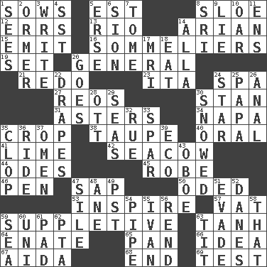 ACROSS 1. Sty mamas 5. Eastern Standard Time (abbr.) 8. _ gin 12. Blunders 13. _ de Janeiro 14. Believer in; advocate of (suffix) 15. Send forth 16. Wine waiters 19. Put into a specified state 20. Commissioned military rank 21. Make new 23. Call ___ day 24. Health resort 27. Vintage cars 30. Comedian Laurel of Laurel & Hardy 31. Michaelmas daisies 34. California wine valley 35. Riding implement 38. Grayish beige 40. Taken by mouth 41. Welles in "The Third Man" 42. Manatee 44. Lyric poems 45. Loose flowing garment 46. Writing instrument 47. Plant excrement 50. Wrote a lyric poem 53. Stimulate to action 57. Large container 59. Supplying deficiencies 63. Hyperbolic tangent 64. Maternal 65. Baking dish 66. The content of cognition 67. Opera by Verdi 68. Conclusion 69. Trial DOWN 1. Observes 2. Abalone 3. Compose 4. Fast jet (abbr.) 5. Celtic language 6. The Jewish people; Israel 7. Heavy book 8. _ Lanka 9. Falsehood 10. Boat paddle 11. Followers of ems 14. Silent film actress Nazimova 17. Medical imaging device (abbr.) 18. Erode 20. Travels 22. Window treatments 24. Play the lead 25. Dad 26. Of or related to the anus 28. Baseball player Mel 29. Oceans 30. Frozen precipiation fell 32. Regret 33. Practice fight 35. Hoof sound 36. Travel on or in a vehicle 37. Presage 39. Environmental prefix 43. Mitch Miller's instrument 47. Filth; sediment 48. One (Scot) 49. Pacific Standard Time (abbr.) 51. Elude 52. Natives or inhabitants of Denmark 54. Corncob 55. _ the terrible 56. Tear apart 58. Not this but _ 59. Ocean 60. University (slang) 61. Groovy apt. 62. Parent Teacher Association (abbr.) 63. Teat (slang)