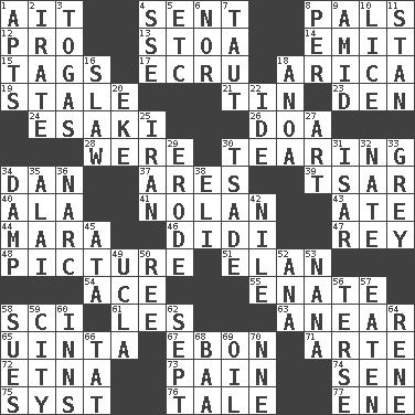ACROSS 1. Small island 4. Emitted 8. Friends 12. Adept person 13. Portico 14. Give off 15. Labels 17. Shade of tan 18. N. Chile seaport 19. Having lost freshness 21. Metal container 23. Lair 24. 1973 Nobel Price Winner (Physics) Leo 26. ___ good deed 28. We are 30. Rending 34. Daniel's nick name 37. Ancient Greek god of war 39. Russian ruler of old 40. In the manner of 41. Pitcher Ryan 43. Had dinner 44. Hindu Mythology: god of death 46. "You Light Up My Life" star Conn 47. Marina Del _, California 48. Photo 51. Enthusiasm 54. Adept person 55. Maternal 58. _-fi 61. French article 63. Approach 65. National forest in Provo, Utah 67. Inky black, to poets 71. Johnson of "Laugh-In" 72. Inactive volcano in Sicily 73. Ache 74. Elected rep. 75. System (abbr.) 76. Falsehood 77. Compass dir. DOWN 1. Flats, for short 2. Feeling or showing extreme anger 3. Ancient Roman robes 4. Compass dir. 5. And so on (abbr.) 6. Or not 7. Tense 8. For each 9. Among 10. Louse (plural) 11. Comedian Laurel of Laurel & Hardy 16. Cole _ (cabbage dish) 18. Small Philippine buffalo 20. Make supply last 22. Binary compound 25. SW Asia republic 27. Nonscientific branch of learning 29. Wear away 30. Sadhe (variant) 31. Austrian river, tributary to the Danube 32. Nathan's nickname 33. Jennifer or Joel 34. Moist 35. Jai _ 36. Drug cop 38. Connecticut Ivy Leaguer 42. "Death on the ____" 45. "One Day ___ Time" 49. Southern CA. univ. 50. To riddle 52. Santa ___, CA 53. Nanny 56. Laconic 57. Consumed 58. Takes to court 59. Municipality 60. Taverns 62. Back-to-school mo. 64. French philosopher Descartes 66. Make lace 68. Sound made by sheep 69. Petroleum 70. Compass dir.