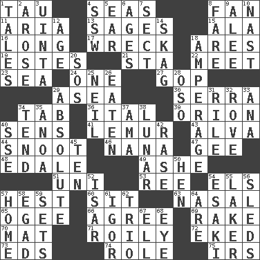 ACROSS 1. The 19th letter of the Greek alphabet 4. Oceans 8. Avid follower 11. Operatic vocal solo 13. Gurus 15. In the manner of 16. Having great length 17. Raze 18. Ancient Greek god of war 19. _____ Park, CO 21. R.R. building 22. Confront 23. Ocean 24. Single 27. Republican Party 29. Toward the sea 30. Father Junipero _ 34. Bar bill 36. Slanted text style (abbr.) 39. Greek mythologigal hunter 40. Elected reps. 41. Arboreal primate 43. Inventor's middle name 44. Snout, nose 46. Grandmother 47. Unit of force equal to gravity 48. Peak District village in England 49. American tennis player Robert 51. University (slang) 53. To separate or throw off 54. Raised railways 57. Behest 60. Be seated 63. Rhinal 65. Double curve, resembling the letter S 66. Match 69. Immoral or dissolute person 70. Floor protector 71. Agitated, as a liquid 72. Supplemented with great effort 73. Begley and Asner 74. Hero or heavy, e.g. 75. Big collection agency DOWN 1. Lies 2. Came up 3. National forest in Provo, Utah 4. Compass dir. 5. Hearing organ 6. Ripens 7. Religious group 8. Conductor's collection 9. Toward shelter 10. Political cartoonist Thomas 12. Ripen 14. Heroin 18. Electrical Measurement 20. Distress signal 25. Famous astronaut Armstrong 26. Ingested 28. Bear (Spanish) 29. Utter; complete 31. Cause heat under the collar 32. Be footloose 33. Santa ___, CA 34. Look after 35. Small Philippine buffalo 37. Wet nurse (var.) 38. Type of eclipse 40. Compass dir. 42. To erase 45. "___ Little Indians" 50. Layer 52. Austrian river, tributary to the Danube 54. 1973 Nobel Price Winner (Physics) Leo 55. Member of a famous L.A. basketball team 56. Bobsleighs 57. Dwelling 58. Mild oath 59. Puts into a specified state 61. Russian composer Stravinsky 62. Musical group of three 64. "We ___ not amused" (Victoria) 67. Pipe bend 68. Sight organ
