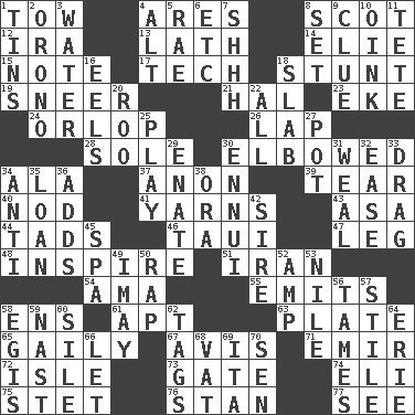 ACROSS 1. Pull behind 4. Ancient Greek god of war 8. Native of Scotland 12. Lyricist Gershwin 13. Thin strip of wood or metal 14. Writer Wiesel 15. Short letter 17. Technical work 18. Check the growth or development of 19. Contemptuous expression 21. Actor Linden 23. Supplement with great effort 24. Fourth or lowest deck 26. Infant locale 28. Flatfish 30. Shoved, as through a crowd 34. Insect wing 37. Soon (poet.) 39. Pull apart 40. Dreamland 41. Entertaining tales 43. White ___ sheet 44. Small amounts or degrees 46. "Change" in Tahitian 47. Part of a journey 48. Stimulate to action 51. SW Asia republic 54. Nursemaid (var.) 55. Sends forth 58. Followers of ems 61. Fitting 63. Food holder 65. Lightheartedly 67. Advice 71. Arab leader 72. Small island 73. Yard entry 74. Connecticut Ivy Leaguer 75. Proofreading order 76. Comedian Laurel of Laurel & Hardy 77. Perceive with the eye DOWN 1. Canisters 2. U. of Maine site 3. Wetness 4. Keyboard modifier key 5. Actress Charlotte 6. And so on (abbr.) 7. Quiet! 8. Arrange properly for use 9. A slight indication 10. Pig sound 11. False hair 16. Snakelike fish 18. Broad, flat, thick piece 20. Friend of Pooh 22. 100% 25. Frolic 27. Cooking vessel 29. Maternal 30. World-weariness 31. Welt 32. Comfort 33. To trail on the ground 34. Opposed to 35. Grant temporary use of 36. Does sums 38. Mouth or opening 42. Beget 45. Health resort 49. "If ____ say so..." 50. Strike 52. Electrical Unit 53. "Death on the ____" 56. Makes less strong or intense 57. Vertical member of a panel or frame 58. The front part of a cuirass 59. Political cartoonist Thomas 60. Drop; flow; fall 62. Labels 64. One of the Great Lakes 66. Allow 68. Large container 69. Call ___ day 70. Elected rep.