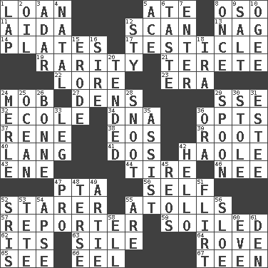 ACROSS 1. Grant temporary use of 5. Had dinner 8. Bear (Spanish) 11. Opera by Verdi 12. Glance over 13. Tired old horse 14. Food holders 17. A testis 19. Noteworthy scarcity 21. Cigar-shaped 22. Old wives' tales, e.g. 23. Epoch 24. Disorderly crowd 27. Hiding places for outlaws 29. Compass dir. 32. Learning spot: Fr. 34. Heredity factor (abbr.) 36. Chooses 37. French philosopher Descartes 38. Greek goddess of the dawn 39. Carrot, for example 40. Austrian-born American filmmaker Fritz 41. Two (Sp.) 42. White Person, in Hawaii 43. Compass dir. 44. Hoop that covers a wheel 46. Born 47. Parent Teacher Association (abbr.) 50. Oneself 52. A viewer who gazes fixedly 55. Ringlike coral islands and reefs 57. Newsperson 59. Dirtied 62. ___ a Wonderful Life 63. Filth; sediment 64. Be footloose 65. Perceive with the eye 66. Snakelike fish 67. Adolescent DOWN 1. Infant locale 2. Petroleum 3. The sixth month of the Jewish calendar 4. Relating to or accompanying birth 5. Adept person 6. Clothes sense 7. Keyboard key 8. Single time 9. Table seasoning 10. Double curve, resembling the letter S 12. Filthy place 15. Wear away 16. The founder of a family 18. Retirement account (abbr.) 20. Looked after 24. Haggard of country music 25. Sea 26. Child's nurse 28. Snob 29. Soup utensil 30. Fur scarf 31. First name in cosmetics 33. Part of a journey 35. Help 36. Mouth or opening 42. Phone greeting 45. Vintage cars 47. Adept person 48. Laconic 49. Nick name for Arthur 51. Talk or behave amorously 52. Indian titles of respect 53. Wig 54. Domed church section 55. "We ___ not amused" (Victoria) 56. A type of plum 58. Pipe bend 60. Night before a holiday 61. Lair