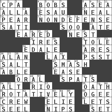 ACROSS 1. Accounting whiz (abbr.) 4. Moves up and down 8. At sea 12. Silent film actress Nazimova 14. Son of Isaac 15. Actress Patricia 16. Lightbulb-shaped fruit 17. Unrelated to defense, as in spending 20. Suttee (variant) 21. "Barney Miller" actor Jack 22. Had dinner 23. Having ears or earlike features 27. A home for chicks 29. Angers 31. Lacquered or enameled metalware 34. Peak District village in England 35. Ancient Greek god of war 36. ____ Jay Lerner 39. Not strict 41. Inconspicuous attention getter 42. Table seasoning 43. Box-office sellout 46. Competent 47. Relaxation 48. Of the mouth 51. Arguments over trivial matters 54. Keyboard modifier key 56. _ de Janeiro 58. Pledge 61. Producing rotation 66. Double curve, resembling the letter S 67. Ship's personnel 68. Writer Wiesel 69. Allows 70. Stitch closed the eyes of (a falcon) 71. Pinches, bites 72. Put into a specified state DOWN 1. Balmoral and tarboosh 2. Entreaty 3. Having winglike extensions 4. Benjamin's nick name 5. Bear (Spanish) 6. Prohibit 7. Beer foam 8. One (Scot) 9. Elected representatives 10. 90 degrees 11. Toward shelter 13. Roberta Peters solo 18. Age 19. Enemy 24. To free from 25. Period 26. Small valley 28. Staphylococcus 30. Gospel singer Marvin 32. French article 33. Eastern Standard Time (abbr.) 34. Keyboard key 36. White ___ sheet 37. Experiment locale 38. One to whom something is allotted 40. Dec. holiday 44. Cleo's killer 45. Ocean 49. Nonscientific branch of learning 50. Cards in a Roman deck? 52. Utensil 53. Gurus 54. Curves 55. Old wives' tales, e.g. 57. Baking chamber 59. False hair 60. Command 62. Leather borer 63. Connecticut Ivy Leaguer 64. Mouth edge 65. Affirmative reply