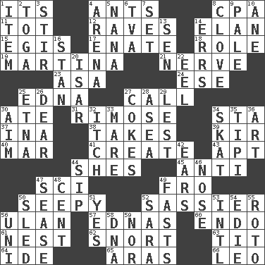 ACROSS 1. ___ a Wonderful Life 4. Pismires 8. Numbers guy (abbr.) 11. Small child 12. All-night dance parties 14. Liveliness 15. Armor plate that protects the chest 17. Related on the mother's side 18. Hero or heavy, e.g. 19. Chrissie's court nemesis 21. Impudent aggressiveness 23. White ___ sheet 24. Compass dir. 25. Pulitzer Prize-winning author Ferber 27. Give a ring to 30. Had dinner 31. Full of chinks, cracks, or crevices 34. R.R. building 37. _ tizzy (2 wds.) 38. Proceeds 39. Apertif with cassis 40. Third mo. 41. Cause to be 43. Fitting 44. "______ My Girl" (Turtles hit) 45. Opposed to 47. _-fi 49. Away 50. Not well drained, as in land 52. More disrespectful 56. Uhlan (variant) 57. Ferber et al. 60. Inside; within (prefix) 61. Egg locale 62. Derisive sound 63. Teat (slang) 64. Binary compound 65. Ancient river in northeast Turkey 66. Lion DOWN 1. A distinct part 2. Ancient Roman robe 3. Disorderly outburst 4. Sports stadium 5. Grandmother 6. Federal power corp. 7. Put into a specified state 8. Garlic unit 9. Light colored 10. One (Scot) 13. Elected rep. 14. Blunders 16. Comedian Laurel of Laurel & Hardy 20. Austrian river, tributary to the Danube 22. Snakelike fish 25. Inactive volcano in Sicily 26. Letter starter 27. Popular sodas 28. At sea 29. For fear that 30. Direct toward a target or goal 32. Hankering 33. Female horse 34. Three-handed card game 35. Native american tent (variation) 36. Tate display 42. Hearing organs 44. Small drink 46. Olfactory organ 47. Gospel singer Marvin 48. Penny 49. Goes without food and/or water 50. Downhill vehicle 51. It is so 52. "Two Mules for Sister ____" 53. International (abbr.) 54. Singer Brickell 55. Printing process, for short 56. Corn or form start 58. Heredity factor (abbr.) 59. Or not