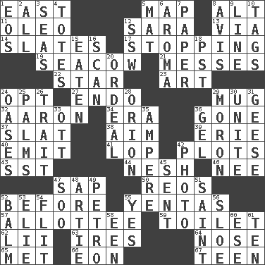ACROSS 1. Compass direction 5. Atlas unit 8. The first octave above the treble staff 11. Margarine 12. "Two Mules for Sister ____" 13. By way of 14. Chalkboards 17. Discontinuing 19. Manatee 21. Makes clutter 22. Play the lead 23. Nonscientific branch of learning 24. Elect 27. Inside; within (prefix) 29. Large cup 32. Composer Copland 34. Epoch 36. Went 37. Narrow board 38. Direct toward a target or goal 39. 4th largest of the Great Lakes 40. Give off 41. Chop off 42. Graphs 43. Fast jet (abbr.) 44. Delicate 46. Born 47. Plant excrement 50. Vintage cars 52. Prior to 55. Gossips 57. One to whom something is allotted 59. Bathroom 62. Cards in a Roman deck? 63. Angers 64. Sense of smell 65. Was introduced to 66. Period of immesurable duration 67. Adolescent DOWN 1. Greek goddess of the dawn 2. 100% 3. Oceans 4. Hauls 5. Floor protector 6. Odor 7. Some stationery 8. Advice 9. Actor's bit 10. Labels 12. Compass dir. 15. Consumed 16. Glance over 18. Pacific Standard Time (abbr.) 20. Severe or trying experience 24. Fertile tracts in a desert 25. Insides of hands 26. Distinguishing feature 28. Constellation of myth 29. Person of subnormal intelligence 30. Join together 31. Honkers 33. Baseball player Mel 35. Electrical Unit 36. Set 42. Picture 45. Posted 47. "Barney Miller" actor Jack 48. Nick name for Arthur 49. Stone: prefix 51. Virtuous person 52. Lip ointment 53. Writer Wiesel 54. Secret move to avoid paying debts 55. It is so 56. _ gin 58. Car or cant ending 60. Compass dir. 61. "___ Little Indians"