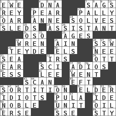 ACROSS 1. She-sheep 4. Heredity factor (abbr.) 7. Droops 11. Marina Del _, California 12. Lightbulb-shaped fruit 13. Chummy 14. Rowing implement 15. Singer Murray 16. Finds the solution 17. Bobsleighs 19. Aide 21. Bear (Spanish) 23. Eons 24. Songbird 25. The 18th letter of the Arabic alphabet 26. Compass dir. 29. Miss Universe 1986, Barbara Palacios _ 30. Raised railways 31. Born 32. Ocean 33. Big collection agency 34. Baseball player Mel 35. Ewer handle 36. _-fi 37. Goodbye (Sp.) 40. Double-curved letter 41. Area sheltered from the wind 42. Gone 43. Skim 45. Bank Draft (abbr.) 46. Conclusion 51. A person who is older than you are 55. Foolish or stupid persons 56. Monetary unit of Botswana 58. Binary compound 59. Impressive in appearance 60. A single undivided whole 61. Lubricate 62. Celtic language 63. Compass dir. 64. Filthy place DOWN 1. Greek god of love 2. Welt 3. Jane of fiction 4. Lair 5. Nanny 6. Ancient Greek god of war 7. Table seasonings 8. Inventor's middle name 9. Small, secluded valley 10. System (abbr.) 12. Went by 13. Airs 16. Attaches a signature 18. Small, narrow, flatbottom fishing boat 20. Moves on water 22. Single 24. Puts on (as clothing) 25. Nest on high 26. Snout, nose 27. Puts into a specified state 28. Soggy 29. Beverages made from leaves 32. Perceive with the eye 33. Ancient Celtic tribe of eastern Britain 36. Narrow boards 37. Deep reverence 38. Outscore 39. International (abbr.) 43. Took without asking 44. Quote 46. Trig term 47. Scent 48. Chest bones 49. Musical composition 50. Religious women 52. "Vaya con ____" 53. Prepare for publication 54. Have confidence or faith in 57. Untruth