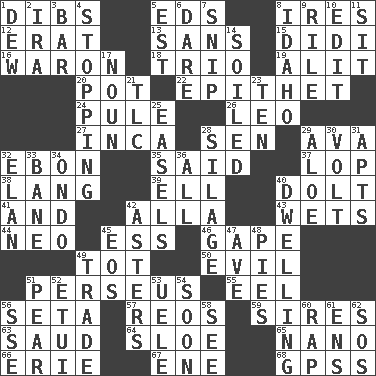 ACROSS 1. Claim 5. Begley and Asner 8. Angers 12. Part of Q.E.F. 13. Without 15. "You Light Up My Life" star Conn 16. Make _____ (do battle with) 18. Musical group of three 19. Came down and settled, as after flight 20. Plant holder 22. Curse 24. Whine 26. Lion 27. South American Indian 28. Elected rep. 29. Actress Gardner 32. Inky black, to poets 35. Expressed in words 37. Trim (branches) 38. Austrian-born American filmmaker Fritz 39. Pipe bend 40. Stupid person 41. Plus 42. Silent film actress Nazimova 43. Soaks 44. Modern: prefix 45. Curvy letter 46. Stare wonderingly 49. Small child 50. Morally bad or wrong 51. Son of Zeus who helped slay Medusa 55. Snakelike fish 56. Stalk of a moss capsule 57. Vintage cars 59. Male parents of animals 63. Saudi Arabian king (1953-1964) 64. _ gin 65. Billionth: prefix 66. 4th largest of the Great Lakes 67. Compass dir. 68. Global Positioning Systems (abbr.) DOWN 1. Morning condensation 2. Retirement account (abbr.) 3. Tavern 4. Closing up, plugging up 5. Eastern Standard Time (abbr.) 6. Have the gumption 7. Clip 8. Potato state 9. Cause heat under the collar 10. Prepare for publication 11. Be seated 14. Dirtied 17. Part of speech 21. Affectionate concern, for short 23. Nine, plus one 25. Artist's stands 28. Fodder prepared in a silo 29. _ vera 30. Electrical Unit 31. Flats, for short 32. Liveliness 33. Object of repulsion 34. Southwest Nigerian state 36. Everything 40. Residence 42. Michaelmas daisies 45. Greek goddess of the dawn 47. "___ Maria" 48. Sliced desserts 49. Barter 51. Lightbulb-shaped fruit 52. Needle holder 53. Ubangi River tributary 54. Within a short period 56. Compass dir. 58. Perceive with the eye 60. Strike 61. Followers of ems 62. Mayday