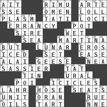 ACROSS 1. Small island 4. Tall New Zealand timber tree 8. Johnson of "Laugh-In" 12. Compass dir. 13. Sign of things to come 14. Hang loosely or laxly 15. Suffix with ecto or cyto 18. Jacques of French films 19. Locales 20. Tendancy to err 22. Cooking vessel 23. The founder of a family 24. Soggy 25. Ocean 26. Chrissie's court nemesis 30. With the exception that 33. Type of eclipse 36. Greek god of love 37. On the rocks 39. Arrange properly for use 40. Comfort 41. Mountain range southwest of Kyrgyzstan 42. Honkers 44. Teachers' org. 45. More disrespectful 47. Make lace 50. Shallow baking pan 51. Mountain range 53. Luau course 54. Winter's stalactites 57. Cowardly lion portrayer 59. Stockings 61. Theater features 63. A single undivided whole 64. NW Algerian seaport 65. Sorrow 66. Lubricates 67. Small pie 68. Compass dir. DOWN 1. Cleo's killer 2. Small island 3. Lacerates 4. College mil. group 5. "If ____ say so..." 6. Was introduced to 7. Corn or form start 8. One to whom something is allotted 9. Carrot, for example 10. Affectionate concern, for short 11. Biblical high priest 16. Indian titles of respect 17. Female horse 21. Actress Patricia 22. For each 24. Armed conflict 26. Floor coverings 27. SW Asia republic 28. Olfactory organ 29. At sea 30. Prejudice 31. Southern CA. univ. 32. Beverages made from leaves 34. One who makes use of a thing 35. Born 38. What propaganda does 42. Commissioned military rank (abbr.) 43. Needle holder 46. One more than two 48. Curves 49. Lie 52. Memorize 53. Silvers or Donahue 54. Austrian river, tributary to the Danube 55. Penny 56. Astound 57. Nilotic language 58. Black tropical American cuckoo 59. Being at a high temperature 60. Mouth or opening 62. Observe