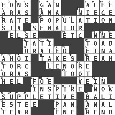 ACROSS 1. Immeasurably long periods of time 5. Separate the seeds from cotton 8. Toward shelter 12. Caspian sea tributary 13. Santa ___, CA 14. Sibling's daughter 15. Assign a rank or rating to 16. Census information 19. R.R. building 20. Elected representative 21. Otherwise 23. And so on (abbr.) 24. Compass dir. 27. Jacques of French films 30. Frog relative 31. Spoke pompously 34. Inactive volcano in Sicily 35. Mine, in Marseilles 38. Receives possession of 40. 480, 500 or 516 sheets of paper 41. Torque (variant) 42. Poe poem 44. Mouths or openings 45. A blast of a horn 46. Cartoonist voice _ Blanc 47. Enemy 50. Distinctive style or manner 53. Stimulate to action 57. At this time 59. Supplying deficiencies 63. Indonesian resort city 64. First name in cosmetics 65. Baking dish 66. Of or related to the anus 67. Pull apart 68. Compass dir. 69. Tear apart DOWN 1. Hearing organs 2. Speak pompously 3. Brizilian seaport 4. Compass dir. 5. Yawn 6. Soon (poet.) 7. California wine valley 8. Small island 9. Flowery wreath 10. Environmental prefix 11. Car or cant ending 14. Drug cop 17. Shoshoni 18. Car dealer's back yard 20. Wither 22. Unemotional ones 24. Brief written record 25. Grandmother 26. Dutch treat 28. Make lace 29. Slanted text style (abbr.) 30. Cigar-shaped 32. Supplement with great effort 33. Gouge 35. Smallest unit of an element 36. Greater amount 37. Spoken 39. "Barney Miller" actor Jack 43. Be footloose 47. Do some clerical work 48. Single 49. Eastern Standard Time (abbr.) 51. Empty; void 52. Pitcher Ryan 54. Corncob 55. "Terrible" tsar 56. French philosopher Descartes 58. Uncontrolled 59. Arrange properly for use 60. Purpose 61. Parent Teacher Association (abbr.) 62. For each 63. Long, evenly shaped piece