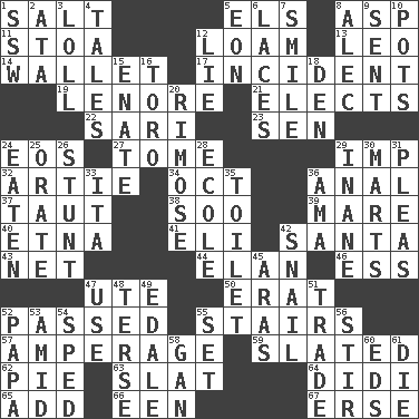 ACROSS 1. Table seasoning 5. Raised railways 8. Viper 11. Portico 12. Rich soil 13. Lion 14. Place for singles 17. Happening 19. Poe poem 21. Opts 22. Indian skirt 23. Elected rep. 24. Greek goddess of the dawn 27. Heavy book 29. Naughty child 32. Nick name for Arthur 34. Sep. follower 36. Of or related to the anus 37. Strained 38. "Barney Miller" actor Jack 39. Female horse 40. Inactive volcano in Sicily 41. Connecticut Ivy Leaguer 42. Before Barbara or Clara 43. Fish or hair follower 44. Liveliness 46. Double-curved letter 47. Shoshoni 50. Part of Q.E.F. 52. Went by 55. Flight of steps 57. Electrical Measurement 59. Scheduled 62. Sliced dessert 63. Narrow board 64. "You Light Up My Life" star Conn 65. Say or write further 66. Car or cant ending 67. Celtic language DOWN 1. Compass dir. 2. _ moment's notice (2 wds.) 3. Hang loosely or laxly 4. Stories 5. A really long time 6. Shoestrings 7. Grin 8. Actor Baldwin 9. Transmitted 10. Cooking vessels 12. Falsehood 15. Related on the mother's side 16. "Corrida" creature 18. Lair 20. Full of chinks, cracks, or crevices 24. Ingested 25. Speak pompously 26. Check the growth or development of 28. Learning spot: Fr. 29. Empty; void 30. Shops 31. Entreaties 33. Call ___ day 35. Bathroom 36. Wet nurse (var.) 42. Slow-paced one 45. Caspian sea tributary 47. Purpose 48. Laconic 49. Peak District village in England 51. Buy and sell 52. Dad 53. Among 54. Hurried 55. Put into a specified state 56. Tumult 58. Separate the seeds from cotton 60. Begley and Asner 61. Pass on