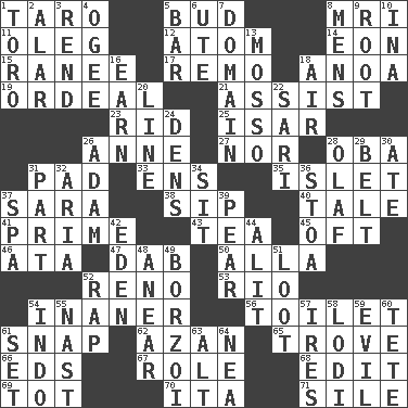 ACROSS 1. Edible starchy tuberous root 5. Partially opened flower 8. Medical imaging device (abbr.) 11. Cassini of fashion 12. Tiny particle 14. Age 15. Indian princess (variant) 17. San ____ (Riviera town) 18. Small Philippine buffalo 19. Severe or trying experience 21. Aid 23. To free from 25. Austrian river, tributary to the Danube 26. Singer Murray 27. Not either 28. Chief or king in Benin or Nigeria 31. Writing tablet 33. Followers of ems 35. Small island 37. "Two Mules for Sister ____" 38. Small drink 40. Falsehood 41. A-one 43. Afternoon social gathering 45. Often (poetically) 46. _ moment's notice (2 wds.) 47. Pat or tap gently 50. Silent film actress Nazimova 52. Western Nevada city 53. River (Sp.) 54. More empty; more void 56. Bathroom 61. Fastener 62. Muslim summons to prayer 65. Collection of objects 66. Begley and Asner 67. Hero or heavy, e.g. 68. Prepare for publication 69. Small child 70. Call ___ day 71. Drop; flow; fall DOWN 1. "Corrida" creature 2. Having or resembling wings 3. Tear apart 4. Double curve, resembling the letter S 5. Soap unit 6. Shoshoni 7. Kingdom 8. Not women's 9. Carrot, for example 10. _ tizzy (2 wds.) 13. With motion or animation 16. Merit 18. Wind 20. Actor's bit 22. Indian skirt 24. Habitations of wild animals 26. First of billions? 28. Norwegian king 29. Waist strap 30. Had dinner 31. Component 32. Roberta Peters solo 34. Be seated 36. Portico 37. Health resort 39. Lightbulb-shaped fruit 42. Paradise 44. Set down 48. Approach 49. Tall, slender dog 51. Spoils 52. Strike 54. _ china 55. Political cartoonist Thomas 57. Angers 58. Farming town in central California 59. Morally bad or wrong 60. Wig 61. Put into a specified state 63. Keyboard modifier key 64. Teachers' org.