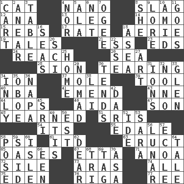 ACROSS 1. Feline 4. Billionth: prefix 8. Volcanic refuse 12. Santa ___, CA 13. Cassini of fashion 14. Like (prefix) 15. Confederate soldiers (slang) 17. Pace 18. Nest on high 19. Stories 21. Curvy letter 23. Begley and Asner 24. Arrive at 26. Ocean 28. The Jewish people; Israel 30. Pulling apart 34. Electrically charged atom 37. Undercover agent 39. Implement 40. Basketball assoc. 41. Make improvements or corrections to 43. Compass dir. 44. Chops off 46. Opera by Verdi 47. Manchild 48. Felt deep pity or tenderness 51. Indian titles of respect 54. ___ a Wonderful Life 55. Peak District village in England 58. Air pressure measure (abbr.) 61. It would 63. Spew [out] 65. Fertile tracts in a desert 67. Singer James 71. Small Philippine buffalo 72. Filth; sediment 73. Ancient river in northeast Turkey 74. 100% 75. Locale of original sin 76. Capital of Latvia 77. To riddle DOWN 1. Haul 2. Approach 3. Eating place 4. And not 5. Chicken ___ king 6. Fish or hair follower 7. Double curve, resembling the letter S 8. A female animal or person 9. Old wives' tales, e.g. 10. Among 11. Moves 16. Oceans 18. Toward the sea 20. _-fi 22. Compass dir. 25. Residence 27. Tate display 29. Wanderer 30. Looks after 31. Charged particles 32. Words to Nanette 33. Small, secluded valley 34. In an inward manner 35. Mitch Miller's instrument 36. California wine valley 38. Luau accessory 42. Have the gumption 45. _ Lanka 49. Nuclear Threat Initiatives 50. Eastern Standard Time (abbr.) 52. Binary compound 53. "Two Mules for Sister ____" 56. Type of eclipse 57. Learning spot: Fr. 58. Airs 59. Alleged 60. Small island 62. Letter starter 64. Falsehood 66. Car or cant ending 68. Three (prefix) 69. Label 70. White ___ sheet