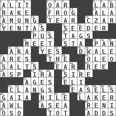 ACROSS 1. Set down 5. Boat paddle 8. Experiment locale 11. Immoral or dissolute person 12. Tree-dwelling hopper 14. Wing 15. Amid 17. Pull apart 18. Russian ruler of old 19. Gossips 21. Sowing specialist 23. Suppuration 25. Labels 26. Rendezvous 27. R.R. building 28. Baking dish 31. Alias (abbr.) 33. Consenting reply 35. A sleeping potion; an opiate (poet.) 37. Ancient Greek god of war 38. Definite Article 40. Margarine 41. Table seasonings 43. Hearing organ 45. Portuguese money of account (variant) 46. Cleo's killer 47. Retirement account (abbr.) 50. Beget 52. Eons 53. Biblical high priest 54. Rigngs loudly 56. Artist's stands 61. Greek goddess of the earth (variant) 62. "Death on the ____" 65. Member of a famous L.A. basketball team 66. Leather borer 67. Toward the sea 68. Painter Guido (1575-1642) 69. Bear (Spanish) 70. Small child 71. Does sums DOWN 1. Like ___ of sunshine 2. Unable to walk 3. Visual representation of an object 4. Portable shelter 5. Often (poetically) 6. "We ___ not amused" (Victoria) 7. Cooks with dry heat, as in an oven 8. Goldbrick 9. Having or resembling wings 10. Oblong piece of solid material 13. Relatively large 16. Yawn 18. Music discs 20. Chop _ 22. Mild oath 24. Proofreading order 26. Vertical spar for supporting sails 28. Light colored 29. Toward shelter 30. Modern: prefix 31. Caspian sea tributary 32. Seaweed 34. A female animal or person 36. Had on 37. White ___ sheet 39. Relaxation 42. Attach a signature 44. Cause heat under the collar 48. Rain (Swedish) 49. Help 51. Monetary unit of Yemen 52. Auto club (abbr.) 54. Crow sounds 55. _ and Stitch 57. "Two Mules for Sister ____" 58. Made supply last 59. Grant temporary use of 60. Indian titles of respect 61. E Mali city 63. Lion 64. Ingest