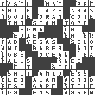 ACROSS 1. Artist's stand 6. Floor covering 9. Before (prefix) 12. Grin 13. Goldbrick 14. Ancient river in northeast Turkey 15. Woman's close-fitting hat 16. NW Algerian seaport 17. ____ d'Azur (French Riviera) 18. Indiana (abbr.) 19. Comedian Laurel of Laurel & Hardy 20. Drink excessively 21. Pulitzer Prize-winning author Ferber 23. RI univ. 24. Singer Brickell 25. Keyboard key 28. Groovy apt. 30. Viva Las _ 34. Grain storage tower 35. Black tropical American cuckoo 36. More valued for its uncommonness 38. Small island 39. Ear part 41. Sea 43. Beverage made from leaves 44. Shopping centers 46. Leg joint 48. Biblical high priest 49. Sew up the eyelids of hawks and falcons 50. In a ____ (agitated or irritated) 51. Among 53. Curvy letter 56. Margarine 57. Having or resembling wings 58. Bitter 60. Respite 61. Open wide 62. Vertical member of a panel or frame 63. Music discs 64. Followers of ems 65. NE Netherlands city DOWN 1. Eastern Standard Time (abbr.) 2. Mine, in Marseilles 3. The Jewish people; Israel 4. Evaded 5. Area sheltered from the wind 6. Hindu Mythology: god of death 7. Muslim summons to prayer 8. Nine, plus one 9. Appease 10. Assign a rank or rating to 11. Compass dir. 13. Globular water bottle used in Asia 14. Oak nuts 19. Scornful expression 20. Third day of the wk. 22. HTML Container Element 24. The property of being fit to eat 26. Writer Wiesel 27. Round or rotation of duties 28. Inside of hand 29. Small Philippine buffalo 31. E Mali city 32. Curve 33. Perceive with the eye 37. Swept the length of 40. American author Paul (1891-1958) 42. Compass dir. 45. Be seated 47. Chooses 49. Male parent of an animal 50. Downhill vehicle 51. ____ Jay Lerner 52. Atlas contents 54. Indian titles of respect 55. Filth; sediment 56. The grampus (Milton) 57. Ripen 58. White ___ sheet 59. Lair