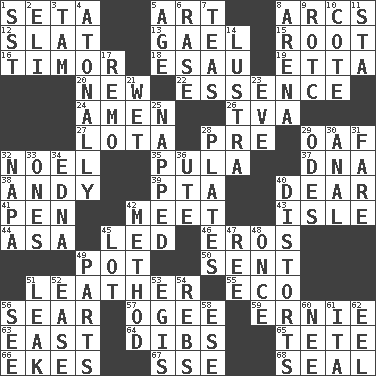 ACROSS 1. Bristle 5. Nonscientific branch of learning 8. Curves 12. Narrow board 13. Highlander 15. Carrot, for example 16. The easternmost of the Lesser Sundas 18. Son of Isaac 19. Singer James 20. ___ Haven, CT 22. Core 24. So be it 26. Federal power corp. 27. Globular water bottle used in Asia 28. Before (prefix) 29. Clumsy lout 32. Christmas carol 35. Monetary unit of Botswana 37. Heredity factor (abbr.) 38. Actor Griffith 39. Parent Teacher Assoc. 40. Letter starter 41. Animal enclosure 42. Confront 43. Small island 44. White ___ sheet 45. Directed 46. Greek god of love 49. Cooking vessel 50. Emitted 51. Cordwainer's material 55. Environmental prefix 56. Burn superficially 57. Double curve, resembling the letter S 59. Bert's buddy 63. Compass direction 64. Claim 65. Wig 66. Supplements with great effort 67. Compass dir. 68. Lick closed DOWN 1. Fast jet (abbr.) 2. Connecticut Ivy Leaguer 3. Scottish cap 4. Without tonality 5. Ripen 6. Raze (variant) 7. Beverages made from leaves 8. Sports stadium 9. College mil. group 10. ____ d'Azur (French Riviera) 11. R.R. building 14. A period of five years 17. San ____ (Riviera town) 21. Dripping 23. First lady 25. Slept 28. Food holders 29. Lyric poems 30. Of or related to the anus 31. Conductor's collection 32. California wine valley 33. Washington bills 34. Pulitzer Prize-winning author Ferber 36. Shoshoni 40. What propaganda does 42. Mode 45. Car dealer's back yard 47. Portuguese money of account (variant) 48. At one time in the past 49. Components 51. Path through which fluid escapes 52. Relaxation 53. The front part of a cuirass 54. Confederate soldiers (slang) 56. Perceive with the eye 58. Compass dir. 60. Born 61. Call ___ day 62. Snakelike fish