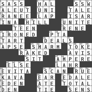 ACROSS 1. Backtalk 5. Actor Linden 8. Compass dir. 11. Eskimo relative 13. Single; one (prefix) 14. Lie 15. Indian princess (variant) 16. Infant locale 17. Austrian river, tributary to the Danube 18. _ tizzy (2 wds.) 19. Land elevation 21. Join together 22. Adolescent 24. French philosopher Descartes 25. Pressed 27. Parent Teacher Association (abbr.) 29. Small pie 30. Allots cards 32. Domed church section 33. Excessive but superficial compliments 35. Puff or smoke 39. Moved through 41. Deliberation 42. Be seated 43. Electrical Unit 45. Otherwise 48. Cowardly lion portrayer 49. Webber/Rice musical 50. Skim 52. Sorrow 55. Polynesian shrub of the pepper family 56. Hearing organ 57. Peak District village in England 59. Locale of original sin 60. Had dinner 61. "_____ Recall" 62. Lair 63. Neckwear 64. Elected reps. DOWN 1. Indian skirt 2. Actor Alda or Thicke 3. Legislators 4. Institute legal proceedings 5. Frame or body of a ship 6. Of or related to the anus 7. Mouth edge 8. Indian antelope 9. Chalkboard 10. Past tense of be (plural) 12. Giggle 14. Prong on a fork 20. Working for oneself (abbr.) 21. Mountain range 23. Keyboard key 25. Call ___ day 26. Reproach for some lapse or misdeed 27. For each 28. Scottish cap 30. Male parent 31. Staphylococcus 33. What Jean-Claude Killy likes to do 34. Was introduced to 36. Make much ado about nothing 37. Apertif with cassis 38. Compass dir. 40. At sea 43. Chicken ___ king 44. French painter Edouard 45. Dodge 46. Make or become more lively 47. Comedian Laurel of Laurel & Hardy 49. Made supply last 50. Suttee (variant) 51. Algonquian 53. ____ Bator 54. Snakelike fish 56. Ingest 58. Two (Sp.)
