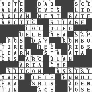 ACROSS 1. Make mention of 5. Small moist lump or mass 8. _-fi 11. The sixth month of the Jewish calendar 12. Nights before holidays 14. Flaplike covering 15. Pitcher Ryan 17. Gone 18. Yard entry 19. Northern region 21. Fodder prepared in a silo 23. Car dealer's back yard 25. Margarine 26. Ubangi River tributary 27. Teachers' org. 28. Plant excrement 31. Two (Sp.) 33. 24 hours 35. Dried seaweed eaten as food 37. Hoop that covers a wheel 38. To separate or throw off 40. Teases 41. Acquire or gain knowledge or skills 43. R.R. building 45. "One Day ___ Time" 46. Music discs 47. Curve 50. ____ Bator 52. Roberta Peters solo 53. Mischievous child 54. "Cheers" or "Ellen" 56. Aid 61. Female horse 62. Wig 65. World-weariness 66. Period 67. Indian titles of respect 68. Arabian gulf 69. Metal container 70. Adept person 71. Airs DOWN 1. Grandmother 2. Aroma 3. Baby powder 4. Part of Q.E.F. 5. Morning condensation 6. "___ Maria" 7. Gillaume's butler role 8. Volcanic refuse 9. Quote 10. Binary compound 13. Vertical member of a panel or frame 16. Mediterranean tributary 18. E Mali city 20. Having a low temperature 22. Path through which fluid escapes 24. Separate forcefully 26. One who makes use of a thing 28. Stricken, poetically 29. Swedish rock group 30. Suppuration 31. Passed on 32. Mouths or openings 34. Affirmative reply 36. Northwest Algerian city 37. Affectionate concern, for short 39. Needle holder 42. Drug cop 44. _ mater 48. Disturbances 49. Device for capturing images 51. Domed church section 52. Had dinner 54. Indian skirt 55. SW Asia republic 57. Fastener 58. Southeast Asian peninsula 59. Takes to court 60. Prong on a fork 61. Was introduced to 63. Nervous spasm 64. Compass dir.