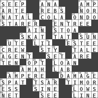 ACROSS 1. Ooze 5. Santa ___, CA 8. Electrical Unit 11. Johnson of "Laugh-In" 12. Confederate soldiers (slang) 14. Not either 15. Brizilian seaport 17. Root beer relative 18. Southwest Nigerian state 19. A viewer who gazes fixedly 21. Main course 23. The 18th letter of the Arabic alphabet 25. Portico 26. Three-handed card game 27. Make lace 28. Player for Phoenix 31. Shoshoni 33. Cards in a Roman deck? 35. First name in cosmetics 37. Ship's personnel 38. Filthy place 40. Falsehood 41. Representative 43. Arrange properly for use 45. "We ___ not amused" (Victoria) 46. "___ Little Indians" 47. Elect 50. Grant temporary use of 52. Nanny 53. Experiment locale 54. Electrical Unit 56. Break 61. Petty quarrel 62. Russian ruler of old 65. The easternmost of the Lesser Sundas 66. Double-curved letter 67. Trig term 68. Moos 69. Fish or hair follower 70. Perceive with the eye 71. Actor's bit DOWN 1. Without 2. Part of Q.E.F. 3. Singer James 4. Lightbulb-shaped fruit 5. Curve 6. Modern: prefix 7. Most capable 8. Singer Murray 9. Method 10. Adept person 13. Before Barbara or Clara 16. Path through which fluid escapes 18. Mouth or opening 20. Monetary unit of Yemen 22. Carry 24. Nuclear Threat Initiatives 26. Stitched 28. Play the lead 29. Ubangi River tributary 30. Born 31. Goad 32. Adolescent 34. ___ a Wonderful Life 36. Comedian Laurel of Laurel & Hardy 37. Feline 39. Shout 42. Heavy book 44. Frog relative 48. Pieces 49. College paper 51. Blind as ____ 52. Fitting 54. Domed church section 55. Vertical spar for supporting sails 57. Place where flour is made 58. Mine, in Marseilles 59. Bride's dress 60. Celtic language 61. Elected rep. 63. A saturated hydrocarbon 64. To sift
