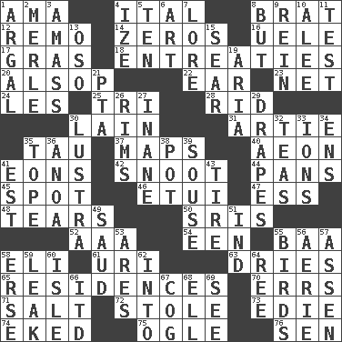 ACROSS 1. Nanny (var.) 4. Slanted text style (abbr.) 8. Naughty child 12. San ____ (Riviera town) 14. Nothings 16. Ubangi River tributary 17. Pate de foie ____ 18. Pleas 20. Columnist Joseph or Stewart 22. Hearing organ 23. Fish or hair follower 24. French article 25. Three (prefix) 28. To free from 30. (Had) reclined 31. Nick name for Arthur 35. The 19th letter of the Greek alphabet 37. Atlas contents 40. A really long time 41. Immeasurably long periods of time 42. Snob 44. Zero-star reviews 45. Specific locale 46. Needle holder 47. Double-curved letter 48. Lacerates 50. Indian titles of respect 52. American Automobile Association (abbr.) 54. Car or cant ending 55. Sound made by sheep 58. Connecticut Ivy Leaguer 61. RI univ. 63. Frees from moisture 65. Dwellings 70. Blunders 71. Table seasoning 72. Took without asking 73. Singer Brickell 74. Supplemented with great effort 75. Stare 76. Elected rep. DOWN 1. Therefore, facetiously 2. Haggard of country music 3. Collect or gather 4. Ending with capital 5. "___ Little Indians" 6. Nonscientific branch of learning 7. Old wives' tales, e.g. 8. Yet 9. It's straight from the horse's mouth 10. Toward shelter 11. Trial 13. Bear (Spanish) 15. Burn superficially 19. Roberta Peters solo 21. Parent Teacher Assoc. 26. Basketball hoops 27. Empty; void 29. Window treatments 30. A period of five years 32. Afternoon social gatherings 33. Charged atoms 34. Followers of ems 35. Drink excessively 36. Small Philippine buffalo 38. Cooking vessel 39. Boozer 41. Eastern Standard Time (abbr.) 43. Become fatigued 49. Saudi Arabian king (1953-1964) 51. Indiana (abbr.) 53. Ancient Greek god of war 55. Avian creatures 56. Nest on high 57. NE Netherlands city 58. Celtic language 59. Path through which fluid escapes 60. Small island 62. To the inside or interior of 64. To sift 66. It would 67. Gear tooth 68. Pipe bend 69. Perceive with the eye