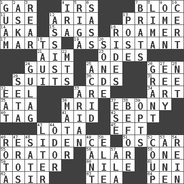 ACROSS 1. Slender fish 4. Big collection agency 7. Group of countries in special alliance 11. Purpose 12. Roberta Peters solo 13. A-one 14. Alias (abbr.) 15. Droops 16. Nomad 17. Shops 19. Helper 21. Direct toward a target or goal 23. Lyric poems 24. Abrupt rush of wind 25. One (Scot) 26. Commissioned military rank (abbr.) 29. Costumes for special activities 30. Music discs 31. To riddle 32. Snakelike fish 33. "We ___ not amused" (Victoria) 34. Nonscientific branch of learning 35. _ moment's notice (2 wds.) 36. Medical imaging device (abbr.) 37. Black 40. Label 41. Help 42. Back-to-school mo. 43. Globular water bottle used in Asia 45. Lizard (obsolete) 46. Dwelling 51. Witty Wilde 55. Speaker 56. Having or resembling wings 58. Single 59. Carrier 60. The longest river in the world 61. University (slang) 62. SW Saudi Arabia district 63. Beverage made from leaves 64. Animal enclosure DOWN 1. Island territory of the United States 2. "____ silly question..." 3. Posterior 4. Lyricist Gershwin 5. Capital of Latvia 6. Backtalk 7. Naughty children 8. Pale green bean 9. Sign of things to come 10. Foregone conclusion 12. Aid 13. Airs 16. Amusement-park features 18. "Change" in Tahitian 20. Message 22. Mountains (abbr.) 24. POW camp 25. Bitter 26. Monetary aid 27. Suggestive of the supernatural 28. Fish or hair follower 29. Stalk of a moss capsule 32. Consume 33. Believer in; advocate of (suffix) 36. Mother 37. Compass dir. 38. Prior to 39. Elects 43. 61 cubic inches 44. Scent 46. Roll call or roster of names 47. Greek god of love 48. Suttee (variant) 49. Patter 50. Writer Wiesel 52. Overturn; upset 53. Queen of England 1702-14 54. It's straight from the horse's mouth 57. Insect wing