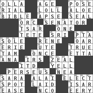 ACROSS 1. Rounded earthenware pot or jar 5. Ripen 8. Introduce or present, as a question 12. Monetary unit of Yemen 13. Hang loosely or laxly 15. _ vera 16. The Good Book 18. Domed church section 19. Lick closed 20. The grampus (Milton) 22. Legislator 24. Russian ruler of old 26. Single 27. False hair 28. _ Lanka 29. Parent Teacher Assoc. 32. Flatfish 35. French philosopher Descartes 37. Boat paddle 38. 4th largest of the Great Lakes 39. Shoshoni 40. Loyal 41. Scottish cap 42. Single time 43. Singer James 44. Santa ___, CA 45. Big collection agency 46. Ardor 49. It would 50. Shout 51. Son of Zeus who helped slay Medusa 55. Teachers' org. 56. "Two Mules for Sister ____" 57. Mountain range southwest of Kyrgyzstan 59. Choose 63. Specific locale 64. Put down 65. Austrian river, tributary to the Danube 66. Comfort 67. Non-commissioned officer (abbr.) 68. Suggestive of the supernatural DOWN 1. Globe 2. Cards in a Roman deck? 3. Experiment locale 4. One to whom something is allotted 5. Wing 6. Republicans 7. Otherwise 8. Thick mixture 9. Margarine 10. Fly high 11. Snakelike fish 14. Poe poem 17. Celtic language 21. Feline 23. Black tropical American cuckoo 25. Summer TV shows 28. Dwarf with a sinus problem 29. Sweet dark-red dessert wine 30. Tense 31. Type of rug 32. Bristle 33. NW Algerian seaport 34. Pale green bean 36. And so on (abbr.) 40. Copy Pinocchio 42. Severe or trying experience 45. It is 47. Car or cant ending 48. Toward shelter 49. Feeling or showing extreme anger 51. Dad 52. Greek god of love 53. Uhlan (variant) 54. Ketch in the Levant 56. Compass dir. 58. Wedding promise 60. Compass dir. 61. 4-wheeled motor vehicle 62. Attempt to accomplish something