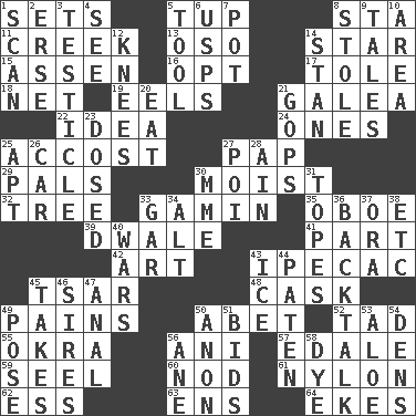 ACROSS 1. Puts into a specified state 5. Uncastrated adult male sheep 8. R.R. building 11. Small stream 13. Bear (Spanish) 14. Play the lead 15. NE Netherlands city 16. Choose 17. Lacquered or enameled metalware 18. Fish or hair follower 19. Snakelike fish 21. An organ shaped like a helmet 22. The content of cognition 24. Singles 25. Buttonhole 27. Infant food 29. Friends 30. Damp 32. Family _ (genealogy) 33. Homeless child 35. Mitch Miller's instrument 39. A sleeping potion; an opiate (poet.) 41. Role in a play 42. Nonscientific branch of learning 43. Medicinal drug used to evoke vomiting 45. Russian ruler of old 48. Keg 49. Aches 50. Collude with 52. Small amount or degree 55. Gumbo ingredient 56. Black tropical American cuckoo 57. Peak District village in England 59. Sew up the eyelids of hawks and falcons 60. Lower and raise head in agreement 61. High-strength synthetic material 62. Curvy letter 63. Followers of ems 64. Supplements with great effort DOWN 1. Glance over 2. Celtic language 3. One of the two male reproductive glands 4. Perceive with the eye 5. Utensil 6. United States Postal Service (abbr.) 7. Plant holder 8. Took without asking 9. Stories 10. Length times width 12. Leg joints 14. Comedian Laurel of Laurel & Hardy 20. Erode 21. Republicans 23. Administered medicine 25. Fitting 26. Automobile 27. Luau course 28. The 18th letter of the Arabic alphabet 30. Madame (abbr.) 31. Drinks excessively 33. Slender fish 34. The first octave above the treble staff 36. Sass 37. Mouth or opening 38. And so on (abbr.) 40. Armed conflicts 43. Frozen water 44. Eucharist need 45. Receives possession of 46. Male parents of animals 47. Of or related to the anus 49. Introduce or present, as a question 50. At once, immediately (arch.) 51. Auction offers 53. Medicinal plant 54. Lairs 56. A saturated hydrocarbon 58. Color