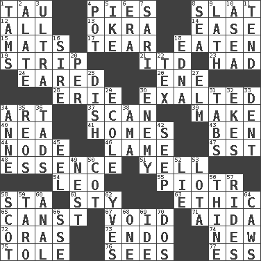 ACROSS 1. The 19th letter of the Greek alphabet 4. Sliced desserts 8. Narrow board 12. 100% 13. Gumbo ingredient 14. Comfort 15. Floor coverings 17. Lacerate 18. Ingested 19. Empty completely 21. It would 23. Possessed 24. Having ears or earlike features 26. Compass dir. 28. One of the Great Lakes 30. Honored 34. Nonscientific branch of learning 37. Glance over 39. Cause to be 40. Teachers' org. 41. Dwellings 43. Benjamin's nick name 44. Connecting point 46. Unable to walk 47. Fast jet (abbr.) 48. Core 51. Shout 54. Lion 55. Peter (Polish) 58. R.R. building 61. Filthy place 63. Value system 65. 2nd pers. sing. pres. of can (arch.) 67. Null 71. Opera by Verdi 72. Mouths or openings 73. Inside; within (prefix) 74. ___ Haven, CT 75. Lacquered or enameled metalware 76. Perceives with the eye 77. Curvy letter DOWN 1. Scottish caps 2. Having winglike extensions 3. Extremist 4. Cooking vessel 5. Mamie's mate 6. Period 7. Indian skirt 8. Ocean 9. Thin strip of wood or metal 10. Toward the sea 11. Look after 16. Male parent of an animal 18. Pulitzer Prize-winning author Ferber 20. For each 22. John Ritter's dad 25. Food container 27. Shade tree 29. Learning spot: Fr. 30. Foe 31. Bar bills 32. Makes supply last 33. Scratch 34. Queen of England 1702-14 35. Vintage cars 36. Small amounts or degrees 38. Nursemaid (var.) 42. Ooze 45. Snakelike fish 49. A home for chicks 50. Small bed 52. Untruth 53. Globular water bottle used in Asia 56. One or ones belonging to thee 57. Amusement-park features 58. Native of Scotland 59. Pacific island yam 60. Of or related to the anus 62. Jacques Cousteau's middle name 64. Crow sounds 66. Compass dir. 68. Single 69. Binary compound 70. Two (Sp.)