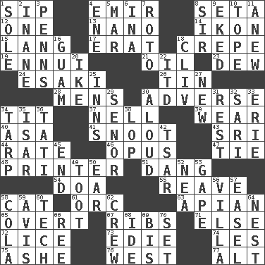 ACROSS 1. Small drink 4. Arab leader 8. Stalk of a moss capsule 12. Single 13. Billionth: prefix 14. Visual representation of an object 15. Long (Scottish) 17. Part of Q.E.F. 18. Streamer paper 19. World-weariness 21. Petroleum 23. Morning condensation 24. 1973 Nobel Price Winner (Physics) Leo 26. Shallow baking pan 28. Not women's 30. Contrary to your interests or welfare 34. Teat (slang) 37. 1994 drama film starring Jodie Foster 39. Erode 40. White ___ sheet 41. Snout, nose 43. _ Lanka 44. Assign a rank or rating to 46. Musical composition 47. Neckwear 48. Hard copy producer 51. Mild oath, euphamism for damn 54. ___ good deed 55. Rob, plunder, or pillage 58. Feline 61. The grampus (Milton) 63. Bee-related 65. Unconcealed 67. Teases 71. Otherwise 72. Louse (plural) 73. Singer Brickell 74. French article 75. American tennis player Robert 76. Compass direction 77. The first octave above the treble staff DOWN 1. Flatfish 2. Empty; void 3. Actor Sean's family 4. Compass dir. 5. Third mo. 6. _ tizzy (2 wds.) 7. Printing process, for short 8. Title for a knight 9. Made supply last 10. Drink excessively 11. Afresh 16. Island territory of the United States 18. 154 in Roman numerals 20. Mamie's husband 22. It would 25. Taverns 27. ___ Haven, CT 29. Sir (Sp.) 30. Verbally 31. Respite 32. Indian skirt 33. 4th largest of the Great Lakes 34. Canvas cover 35. Austrian river, tributary to the Danube 36. Jacques of French films 38. Chop off 42. Russian ruler of old 45. Conclude 49. A blast of a horn 50. Ewer handle 52. Teachers' org. 53. Stare wonderingly 56. Country estate 57. Artist's stand 58. Root beer relative 59. Opinion 60. Technical work 62. Ship's personnel 64. Egg locale 66. Portuguese money of account (variant) 68. Binary compound 69. Altar cloth linen 70. Arrange properly for use