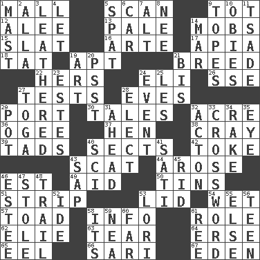 ACROSS 1. Promenade 5. Glance over 9. Small child 12. Toward shelter 13. Light colored 14. Crowds into 15. Narrow board 16. Johnson of "Laugh-In" 17. Capital of Western Samoa 18. Make lace 19. Fitting 21. A special lineage 22. Possessive pronoun 24. Biblical high priest 26. Compass dir. 27. Trials 28. Nights before holidays 29. Sweet dark-red dessert wine 30. Falsehoods 32. 1/640 square mile 36. Double curve, resembling the letter S 37. Layer 38. Supercomputer manufacturer 39. Bits 40. Religious groups 42. Casino tip 43. Jazz singing style 44. Came up 46. Eastern Standard Time (abbr.) 49. Assist 50. Airtight sealed metal containers 51. Empty completely 53. Flaplike covering 54. Dripping 57. Frog relative 58. Information 61. Hero or heavy, e.g. 62. Writer Wiesel 63. Rend 64. Celtic language 65. Snakelike fish 66. Indian skirt 67. Paradise DOWN 1. Vertical spar for supporting sails 2. Silent film actress Nazimova 3. Resembling or made to resemble leather 4. Allow 5. Argument over a trivial matter 6. Auto 7. The first octave above the treble staff 8. Born 9. Drinks excessively 10. Off-Broadway awards 11. Sadhe (variant) 14. Spoil 19. Tate display 20. Inconspicuous attention getter 21. Again 23. _____ Park, CO 24. Incident 25. French article 27. Ancient Roman robe 28. Opt 29. Cooking vessel 31. Forward in time 32. 13-14th century defensive garment 33. What you're doing now 34. Libertine 35. Sight organ 40. _-fi 41. Suttee (variant) 43. Plant excrement 45. To free from 46. First name in cosmetics 47. Fur scarf 48. Get behind 52. Binary compound 53. Australian parrot (variant) 55. Otherwise 56. Adolescent 58. It is 59. Teachers' org. 60. At a great distance 61. To separate or throw off